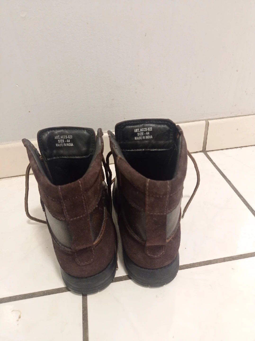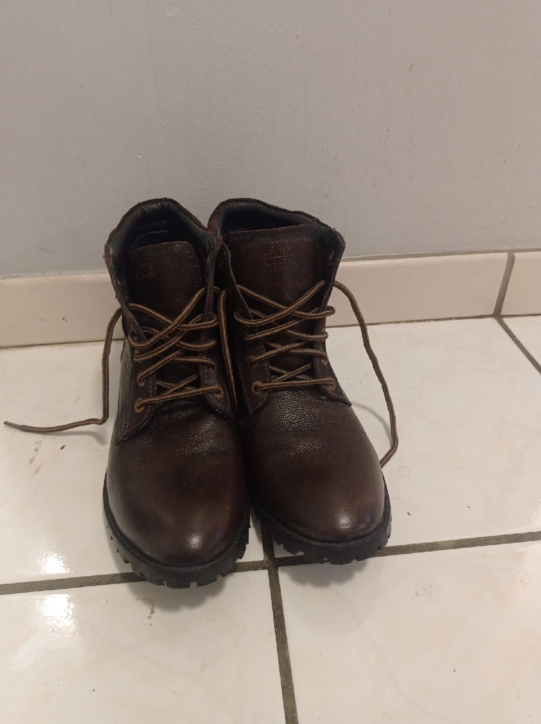 Selling a pair of leather ankle boots ( Allen Cooper), in a dark brown colour. They are in good condition and size 44