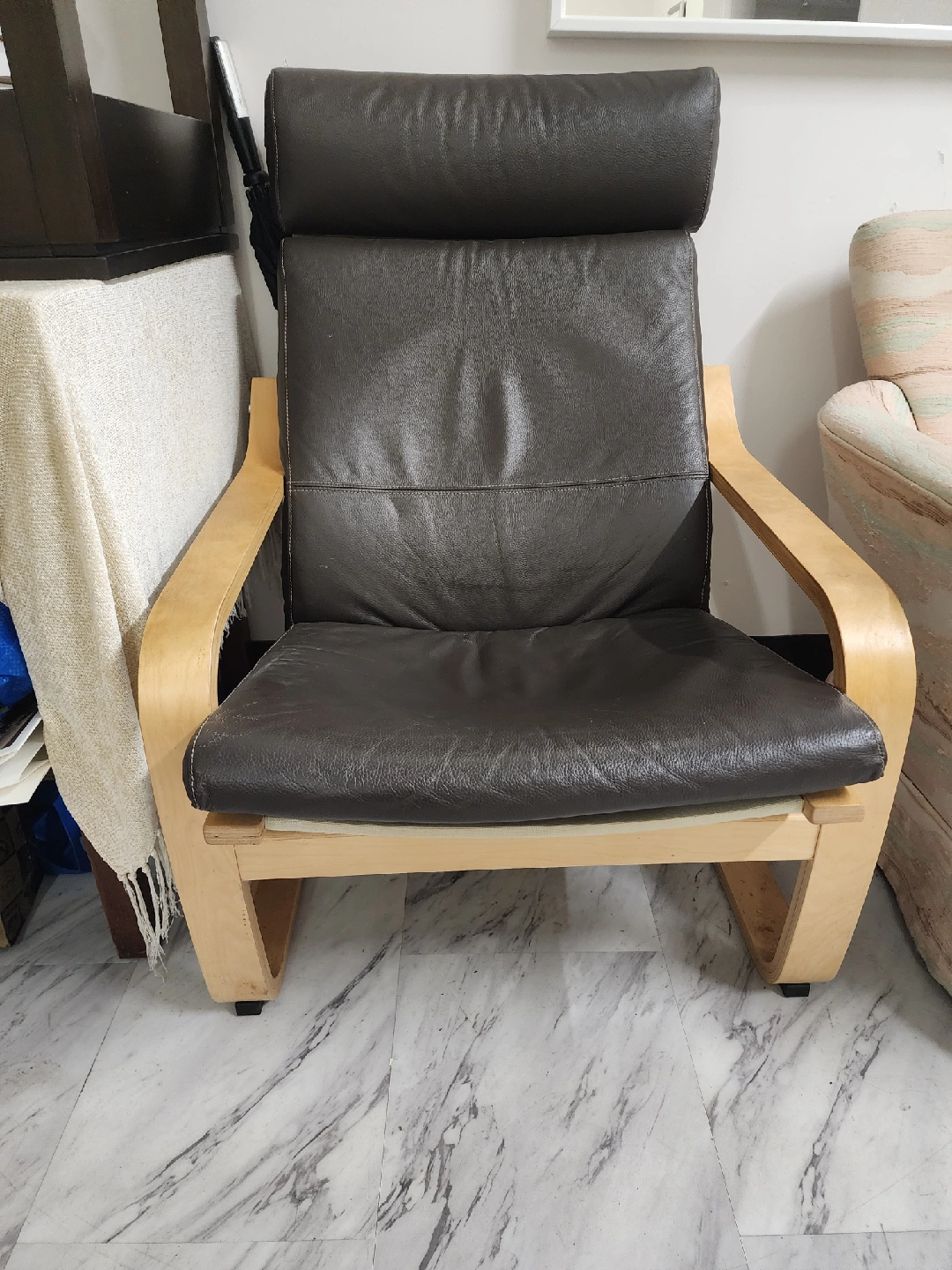 Comfortable leather armchair with a wooden frame. It's in good condition and ready for a new home. Perfect for relaxing after a long day!