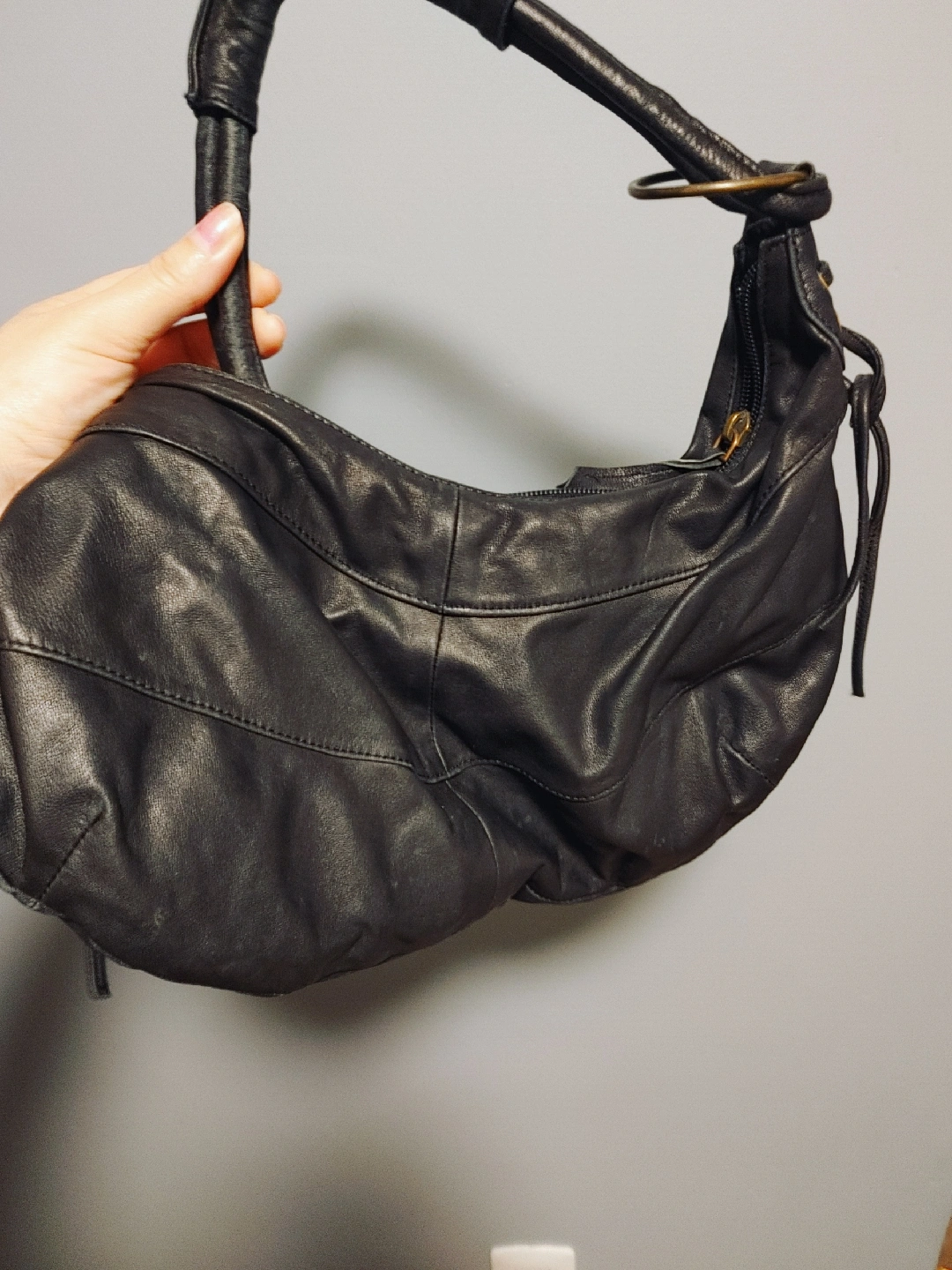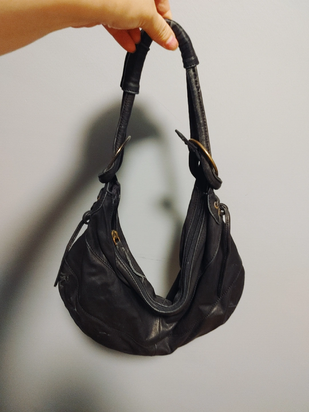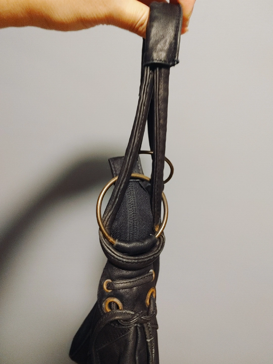 Selling a stylish leather bag. It's in good condition and has a unique design with metal ring details. Perfect for everyday use!