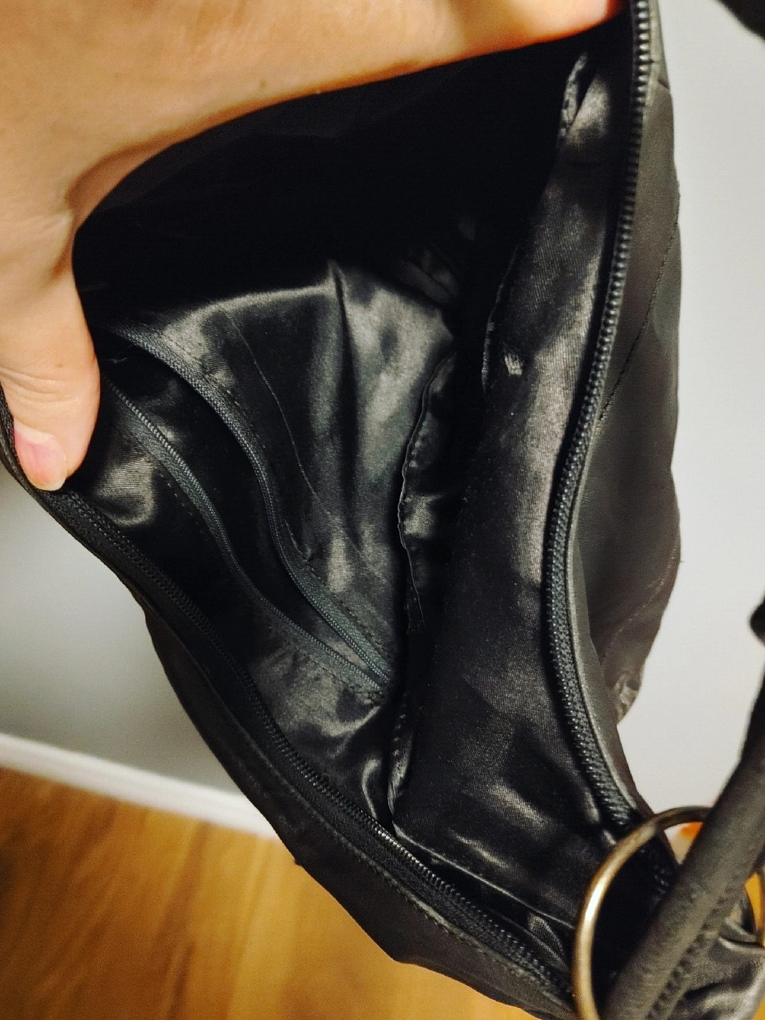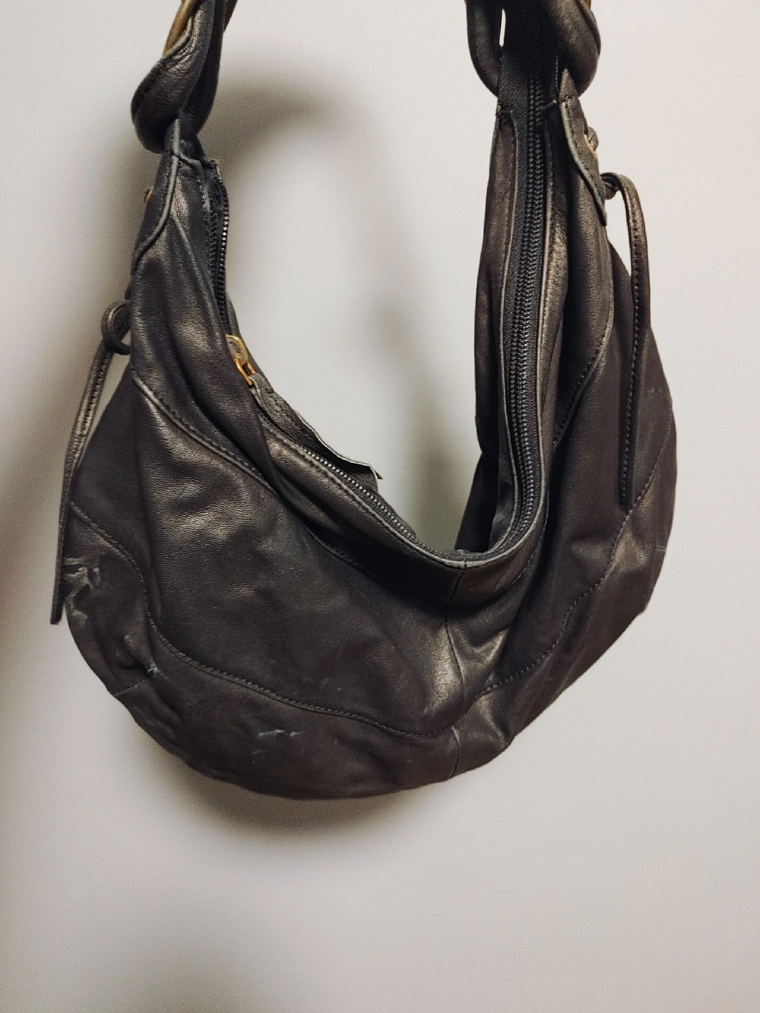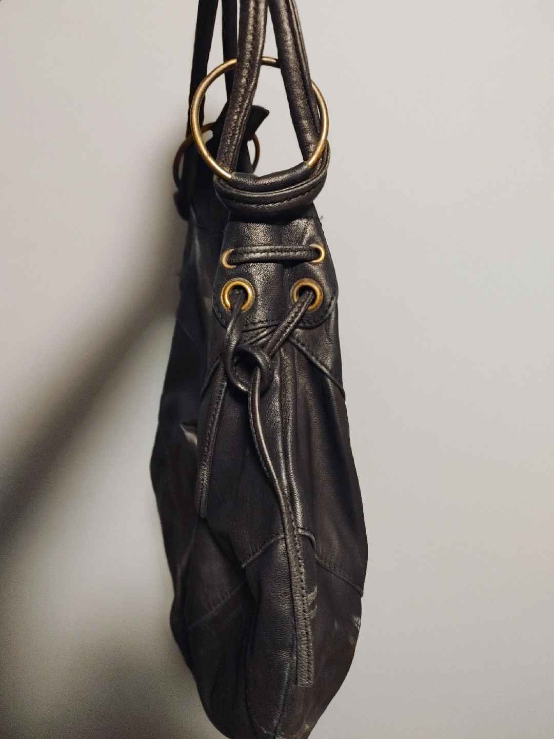 Selling a stylish leather bag. It's in good condition and has a unique design with metal ring details. Perfect for everyday use!