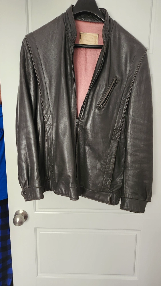 Selling a Leather Hide House grey leather jacket. It's in great condition and ready for a new home! The jacket features a stylish design with a zipper and a unique collar. Perfect for adding a touch of classic style to your wardrobe
