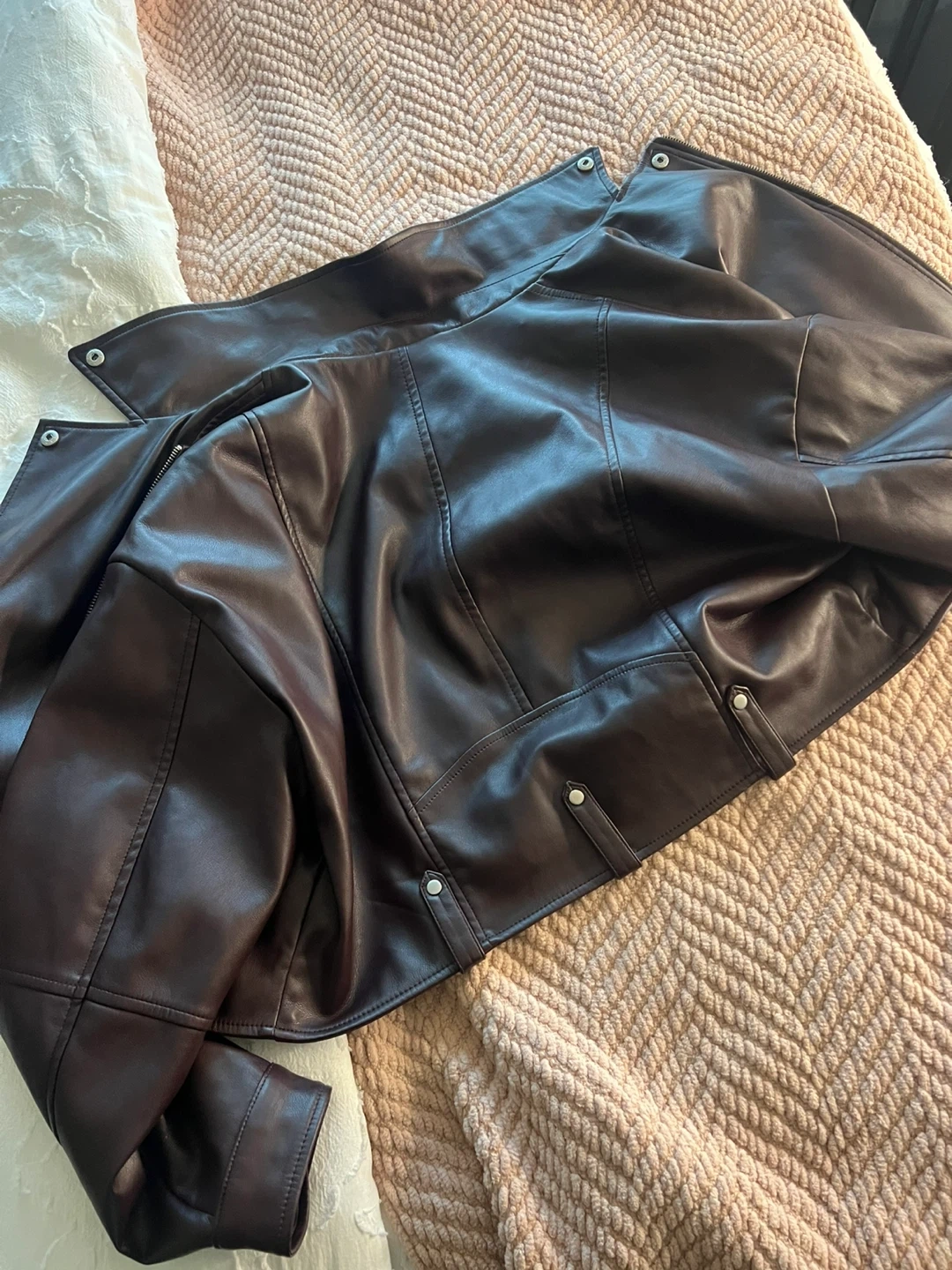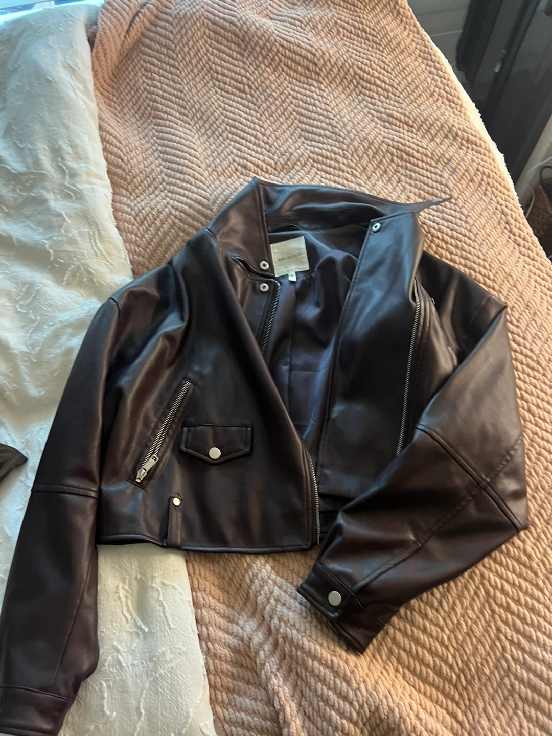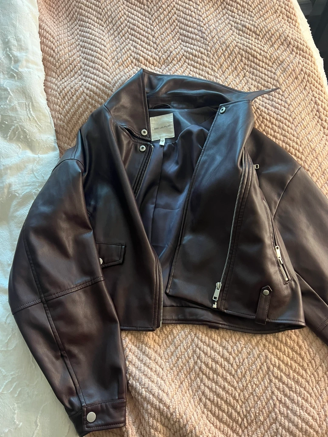 Selling a Avec Les Filles leather jacket in a beautiful dark brown/maroon colour. It's a size medium and in great condition. Never worn. Perfect for adding a touch of style to any outfit!