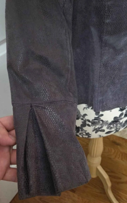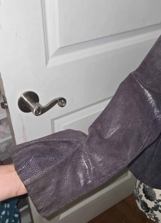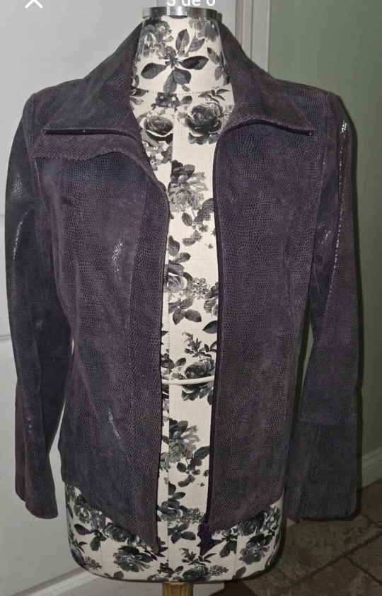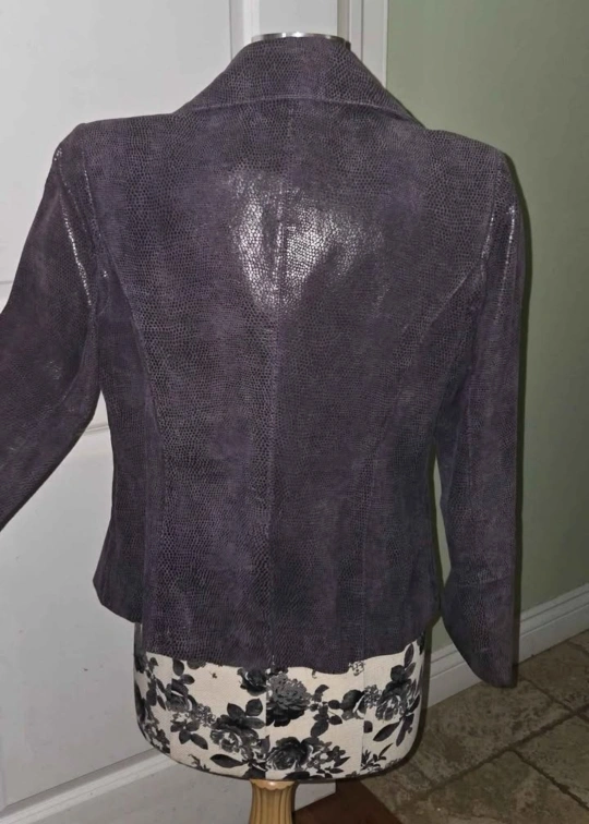 22Selling a nice purple leather jacket. It's a size small and made of genuine leather. The jacket is in perfect condition and has a unique snakeskin pattern. Good for adding a bit of edge to your wardrobe!