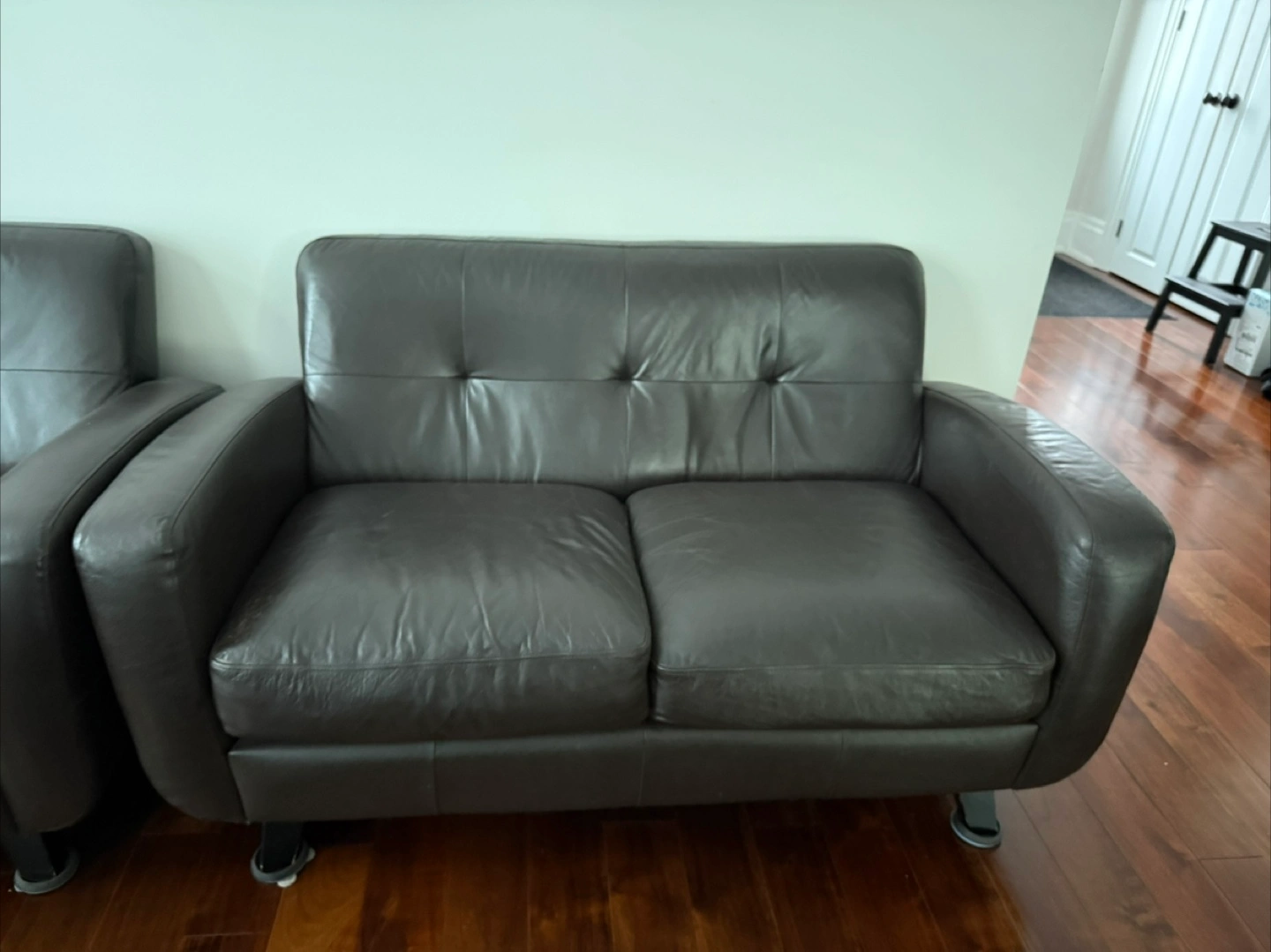 Comfy leather loveseat in brown. 57 W x 30 D $125 Comfy leather 3 seater couch brown. 79W x 30D $225 $300 for both There are some signs of wear on the cushions, but it's still in good condition and ready for a new home!