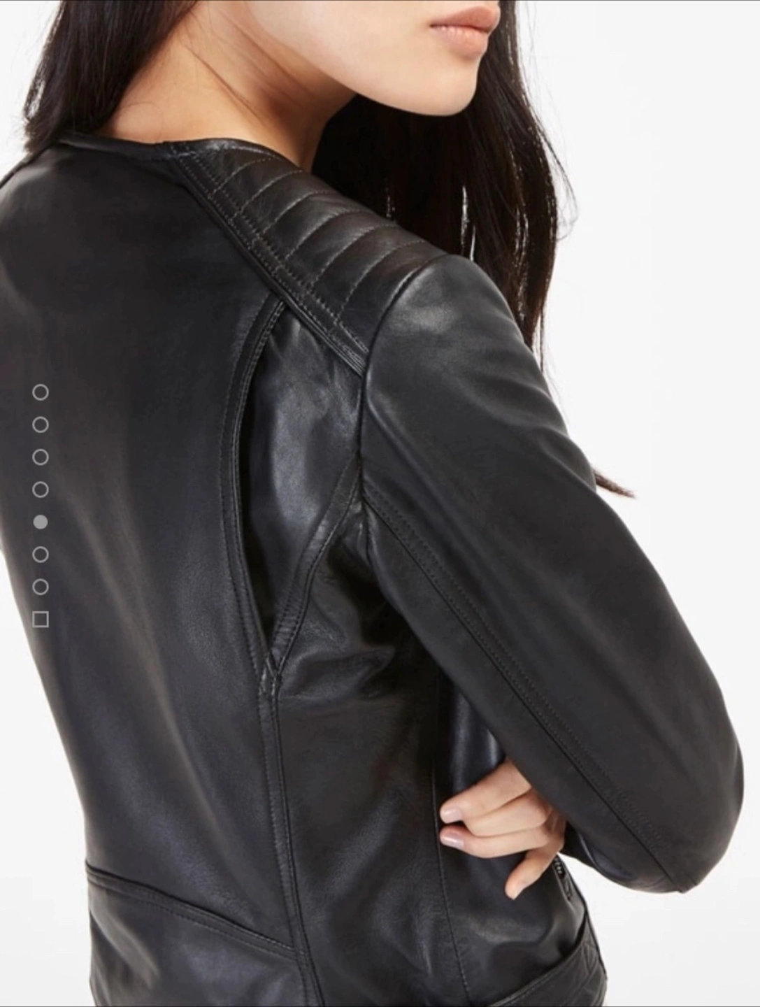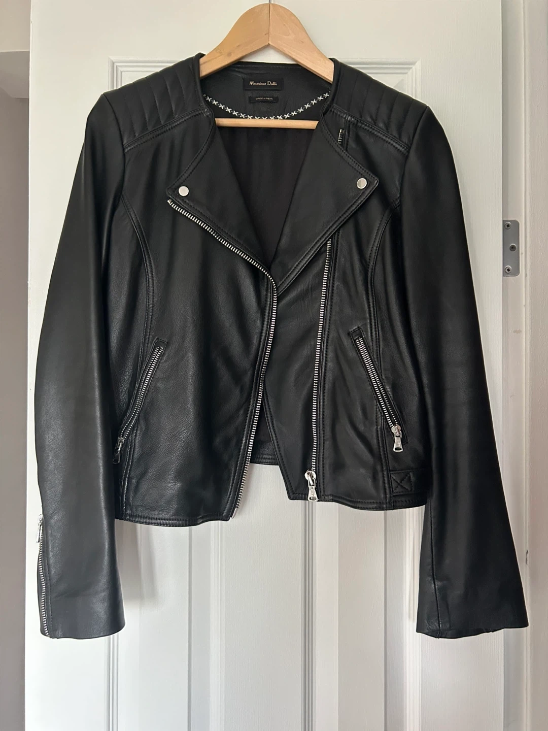 A stylish black leather moto jacket! Perfect for adding a bit of edge to any outfit. Great for layering or wearing on its own during milder weather.
