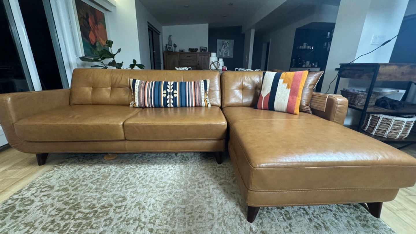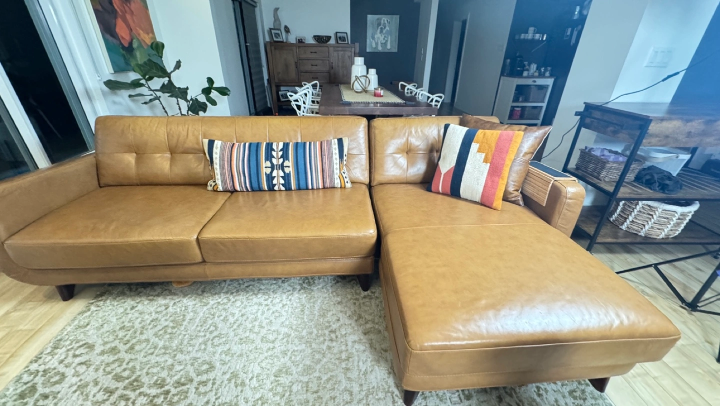 34Brown leather sectional sofa with a chaise lounge. The couch has a tufted back and arms, and the chaise lounge is a good size for lounging. Genuine leather sofa mid-century modern. Paid $4400+tax from Wayfair https://www.wayfair.ca/furniture/pdp/corrigan-studio-1115-wide-genuine-leather-sofa-chaise-c009331473.html?piid=1985256246