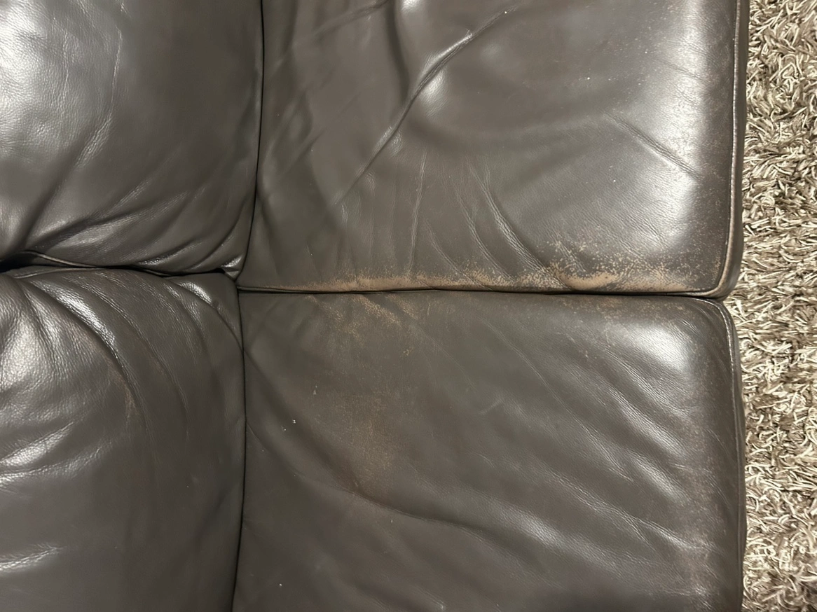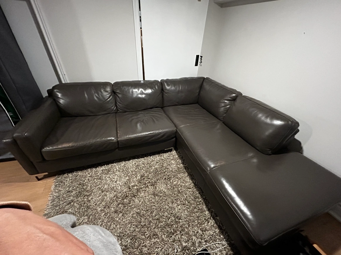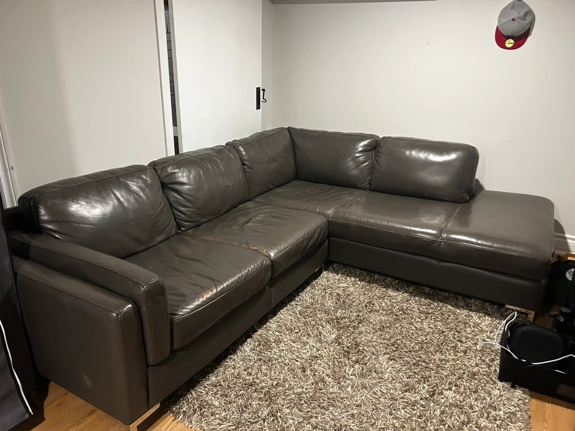 This is a large, dark brown leather sectional sofa. It is in good condition. Basement couch natural wear in leather as shown in photo Depth 38.5” Height 30” Length 96” Chaise length end to end 81” Open to negotiation Pick up only, no delivery. Leslie and Dundas