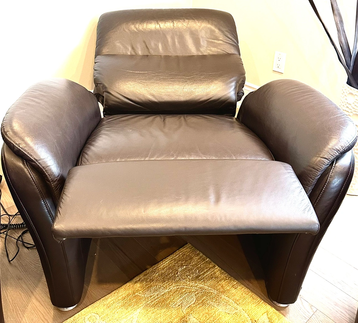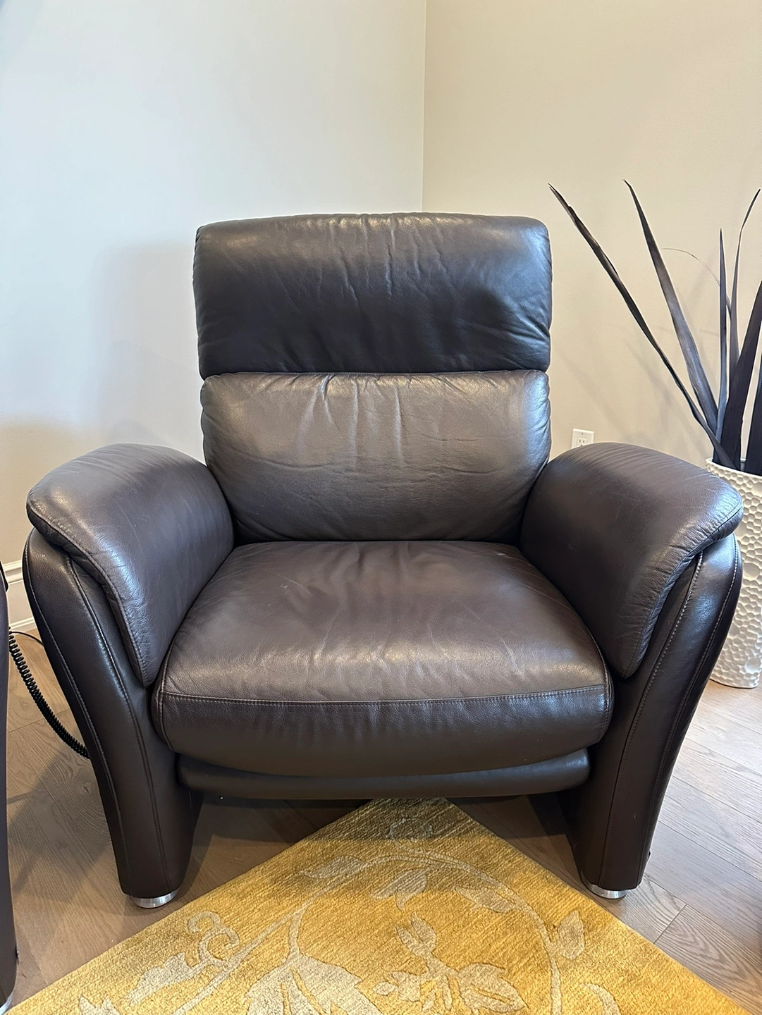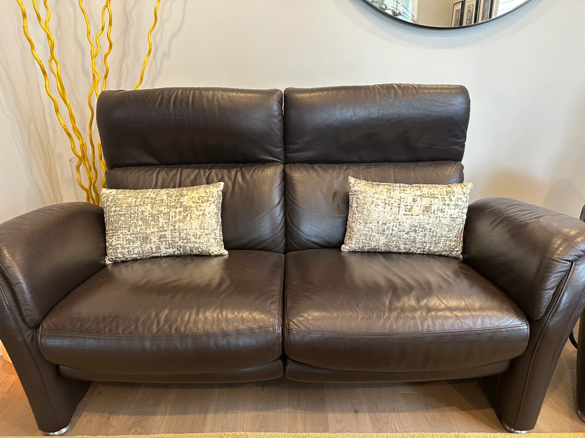 10This is a beautiful leather sofa and armchair set in a deep brown colour. The set is made of high-quality leather and is in excellent condition. The set features a comfortable and supportive design that is perfect for relaxing and entertaining guests. The set is also very durable and will last for years to come. Luxury recliners -3 piece *Single- 39 x 32 electrically operated to fully recline *Double seater- all recline 65 x 32in *Three seater- all recline 85 x 32in Willi Schillig Ergoline made in Germany Elegant, full grain, high quality, soft, dark brown leather, modern and cosy. Hand crafted with steel frame construction. All seats recline fully. Like new, hardly used. Great for living room or cinema room