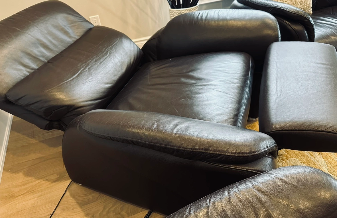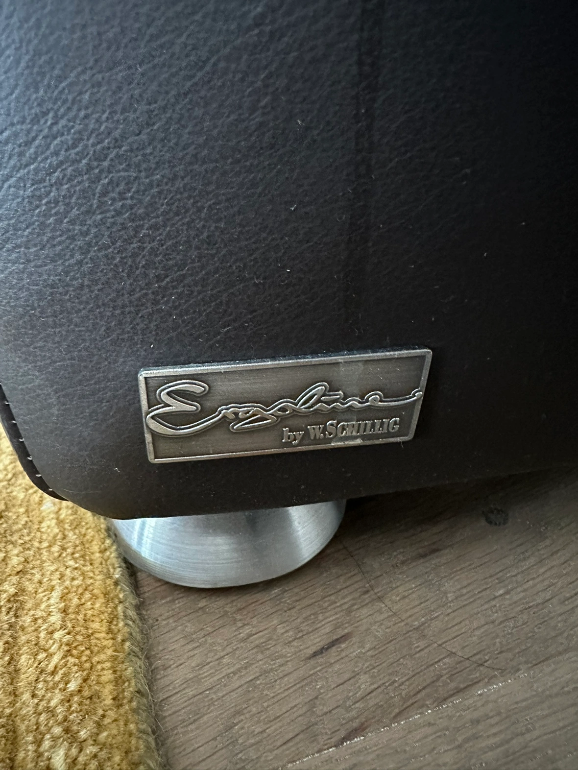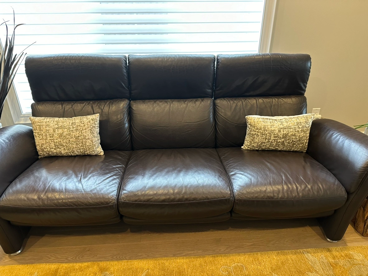 10This is a beautiful leather sofa and armchair set in a deep brown colour. The set is made of high-quality leather and is in excellent condition. The set features a comfortable and supportive design that is perfect for relaxing and entertaining guests. The set is also very durable and will last for years to come. Luxury recliners -3 piece *Single- 39 x 32 electrically operated to fully recline *Double seater- all recline 65 x 32in *Three seater- all recline 85 x 32in Willi Schillig Ergoline made in Germany Elegant, full grain, high quality, soft, dark brown leather, modern and cosy. Hand crafted with steel frame construction. All seats recline fully. Like new, hardly used. Great for living room or cinema room