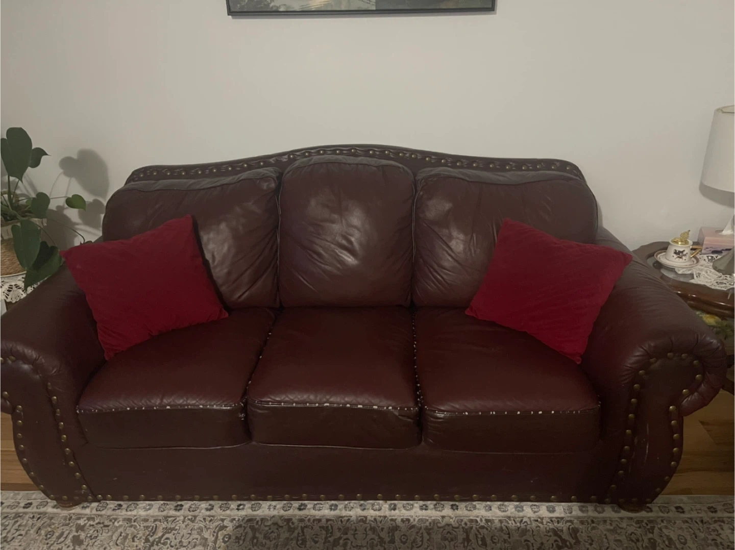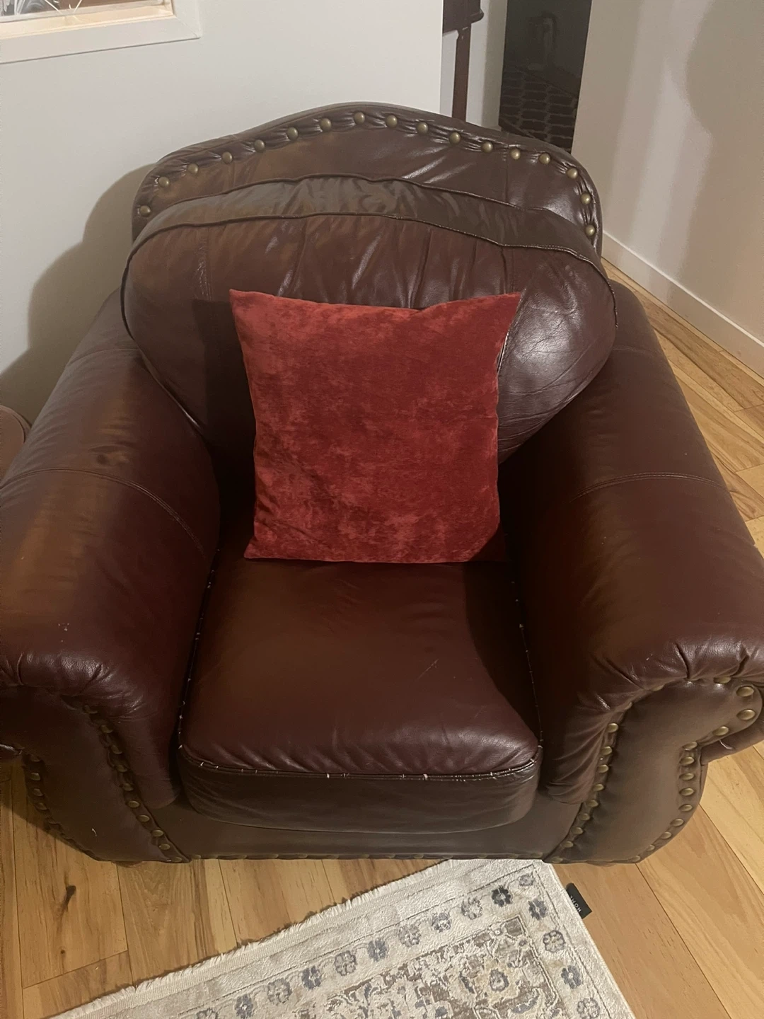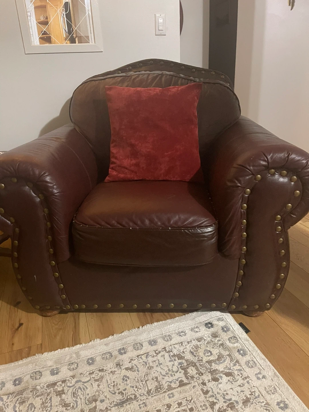 10Selling a brown leather sofa and two armchairs. The set has a classic design with brass stud detailing. They are in good used condition, perfect for a cozy living space! -3 piece sofa seat - Pet free - Smoke free - Real leather - Price negotiable - Pick Pineridge Ne