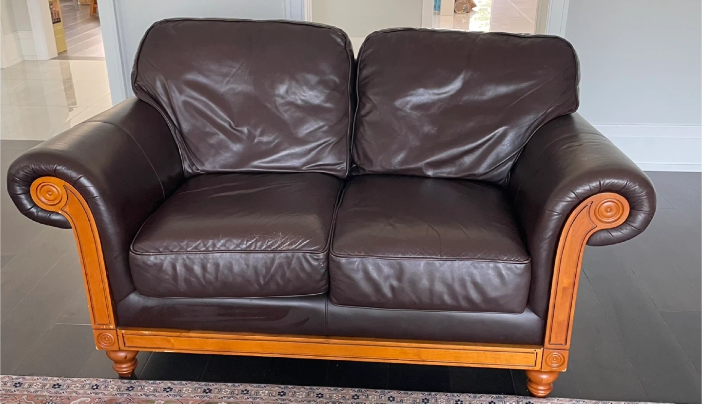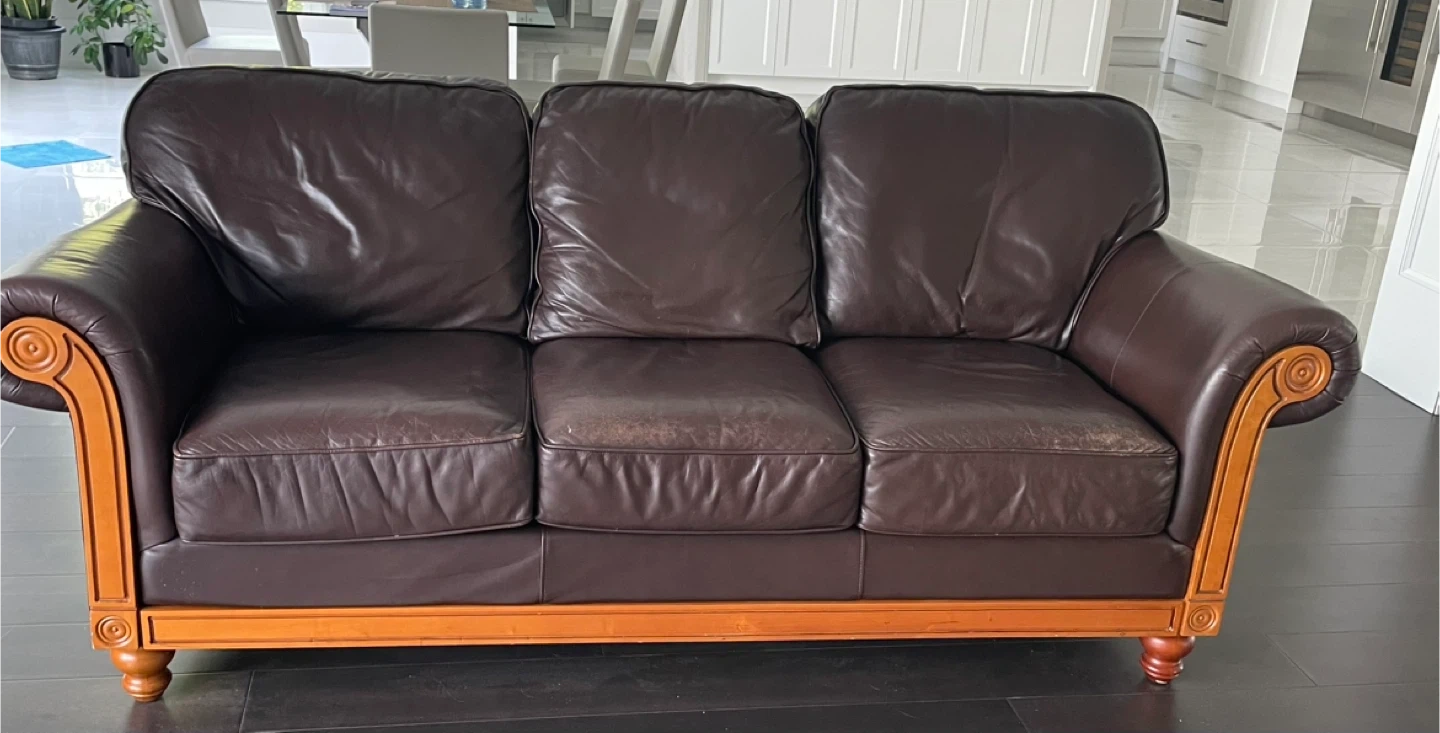 Selling a comfortable leather sofa set, including a 2-seater and a 3-seater. The sofas have a classic design with wooden trim and removable cushions in very good condition. Perfect for a living room or family space! Also very good for cottage family rooms! We can deliver up to 15 KM from my place ๐