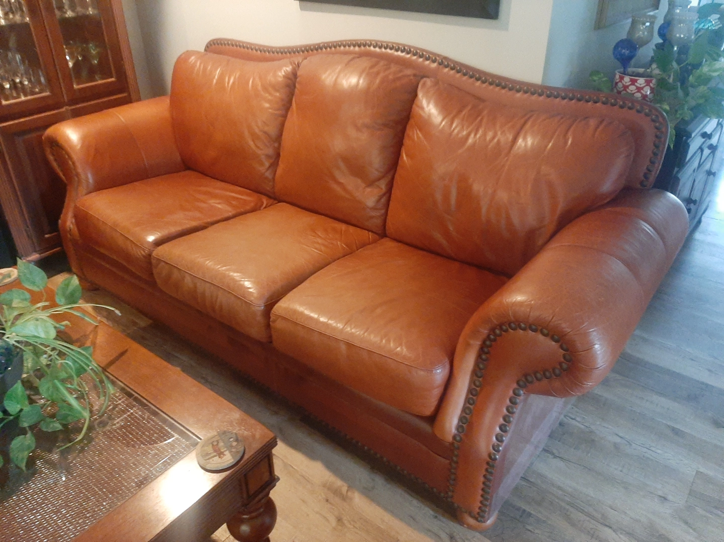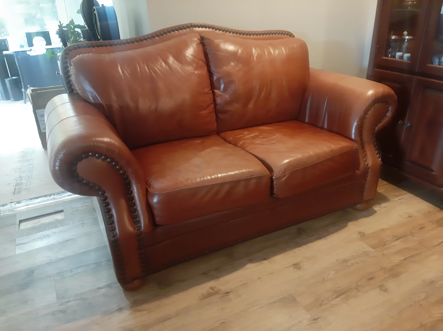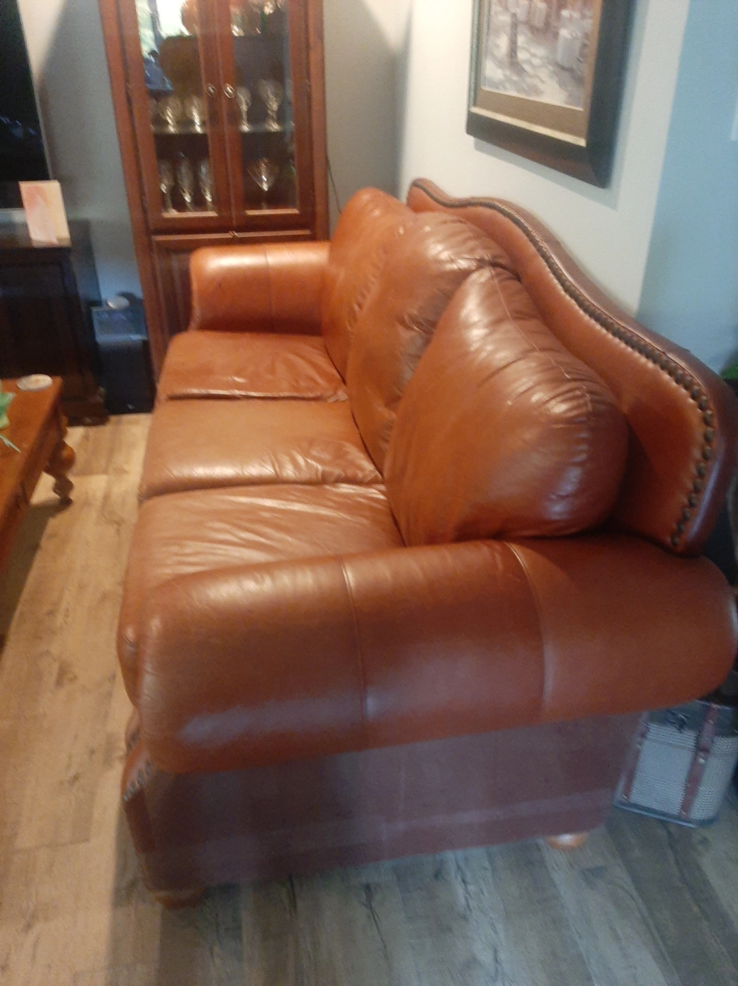 5Selling a well-loved leather sofa set, including a 3-seater sofa and a loveseat. The set is in good condition and would be a great addition to any living room! The leather has a lovely patina and the nailhead trim adds a touch of classic style