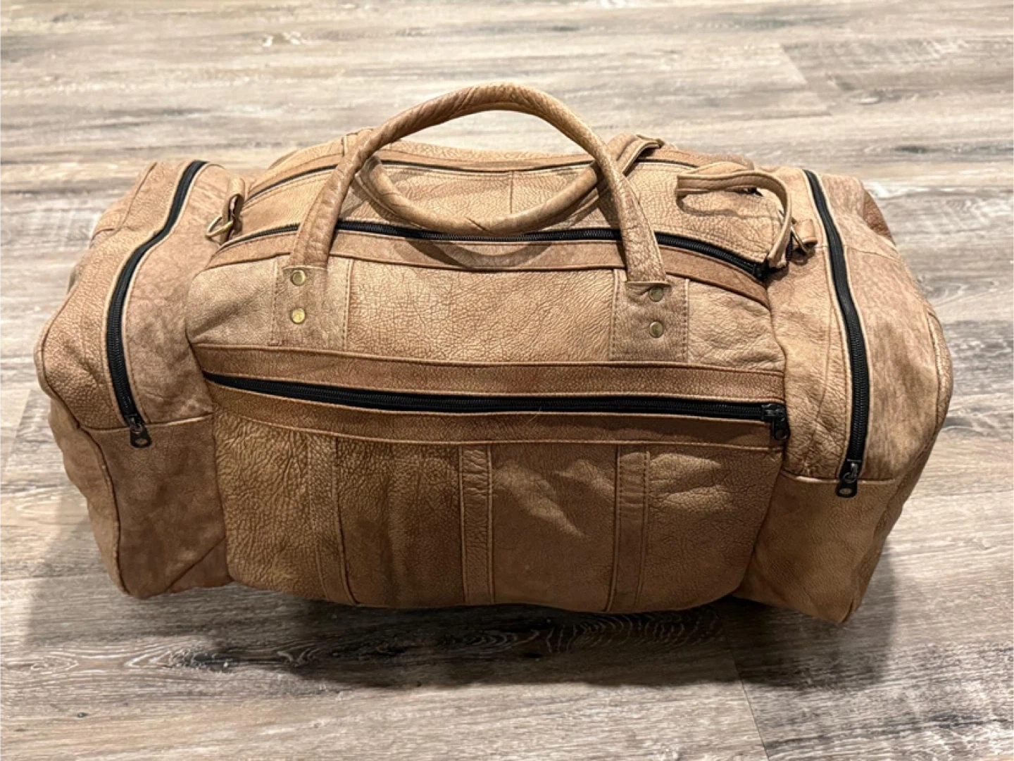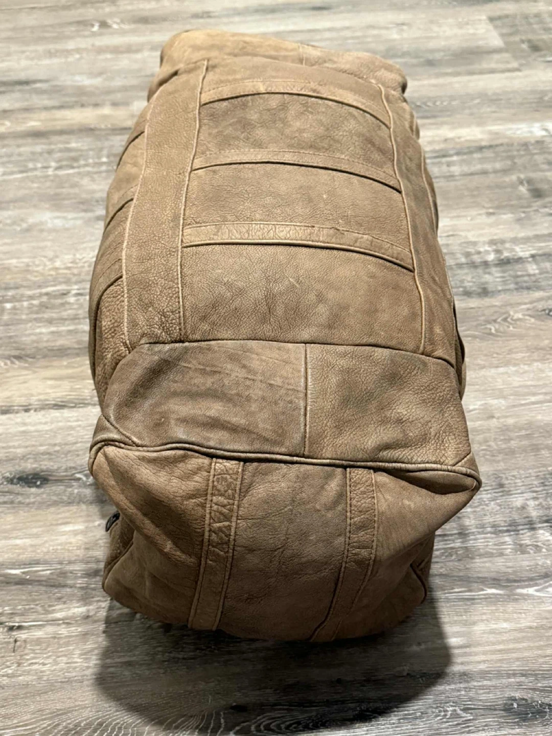Selling a leather weekend bag! It's a great size for weekend trips or hitting the gym. It's a nice brown colour with black zippers. Length 31 inches Width 10 inches Height 9.5 inches Not lined and no matching shoulder strap. Although I have included the one we used with it Pick up Sage Hill NW Cash only Pet and smoke free home Check out my other items