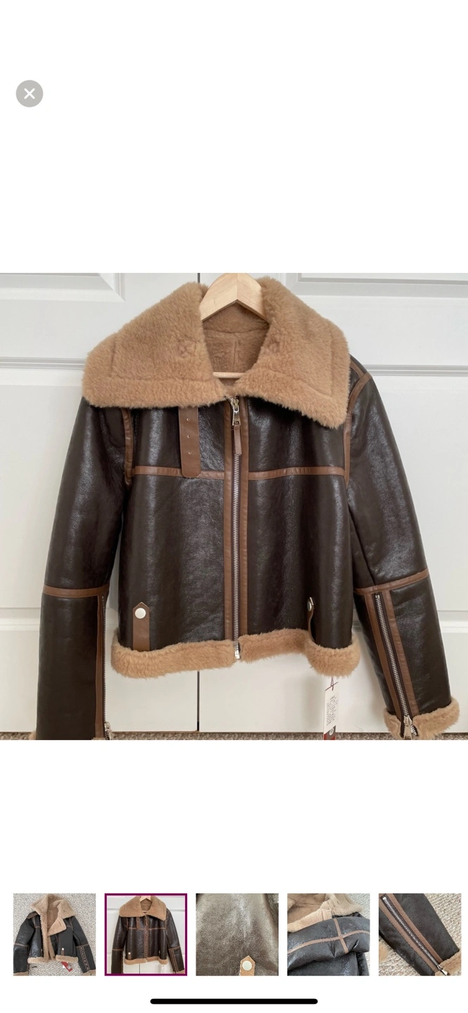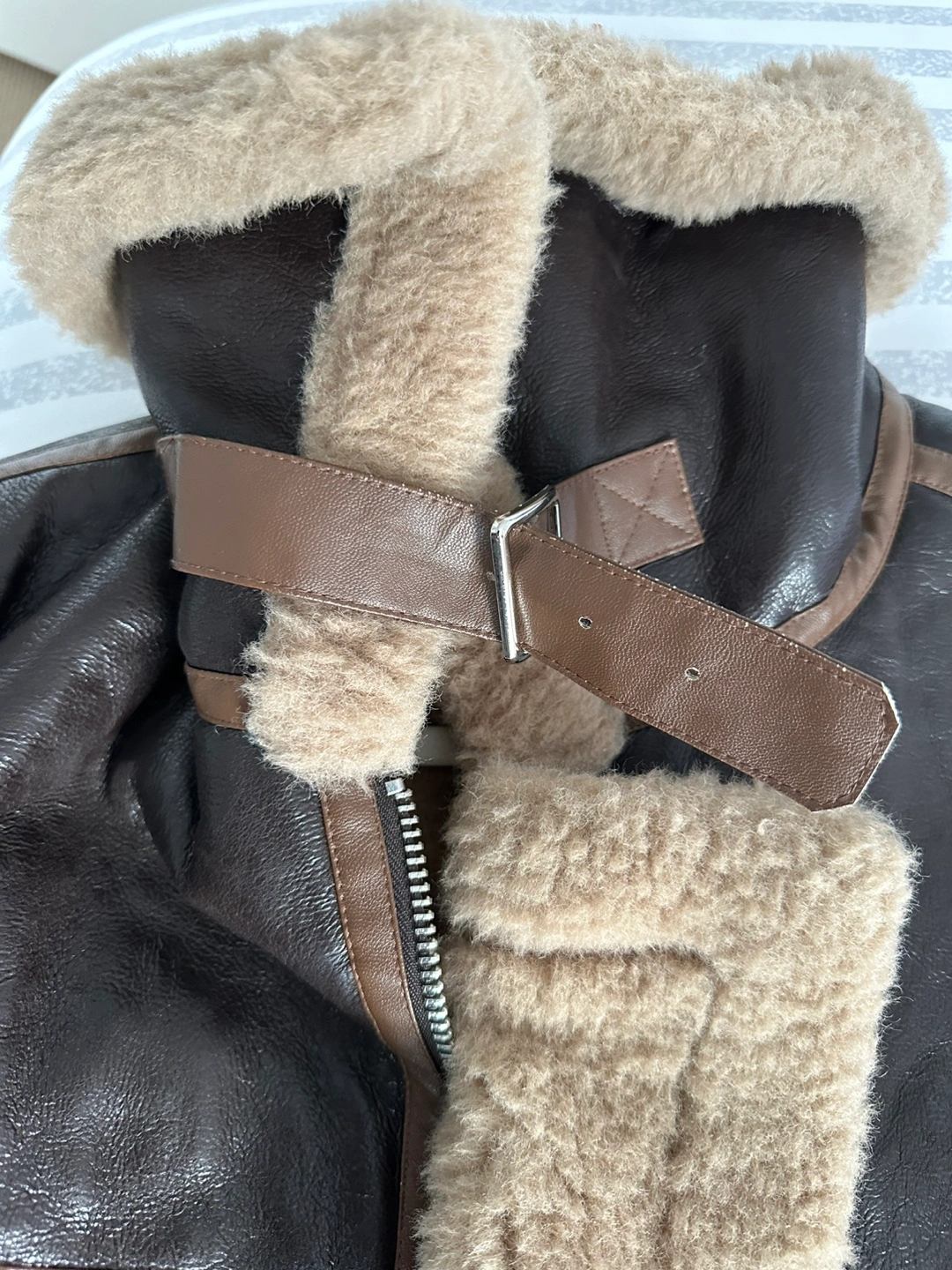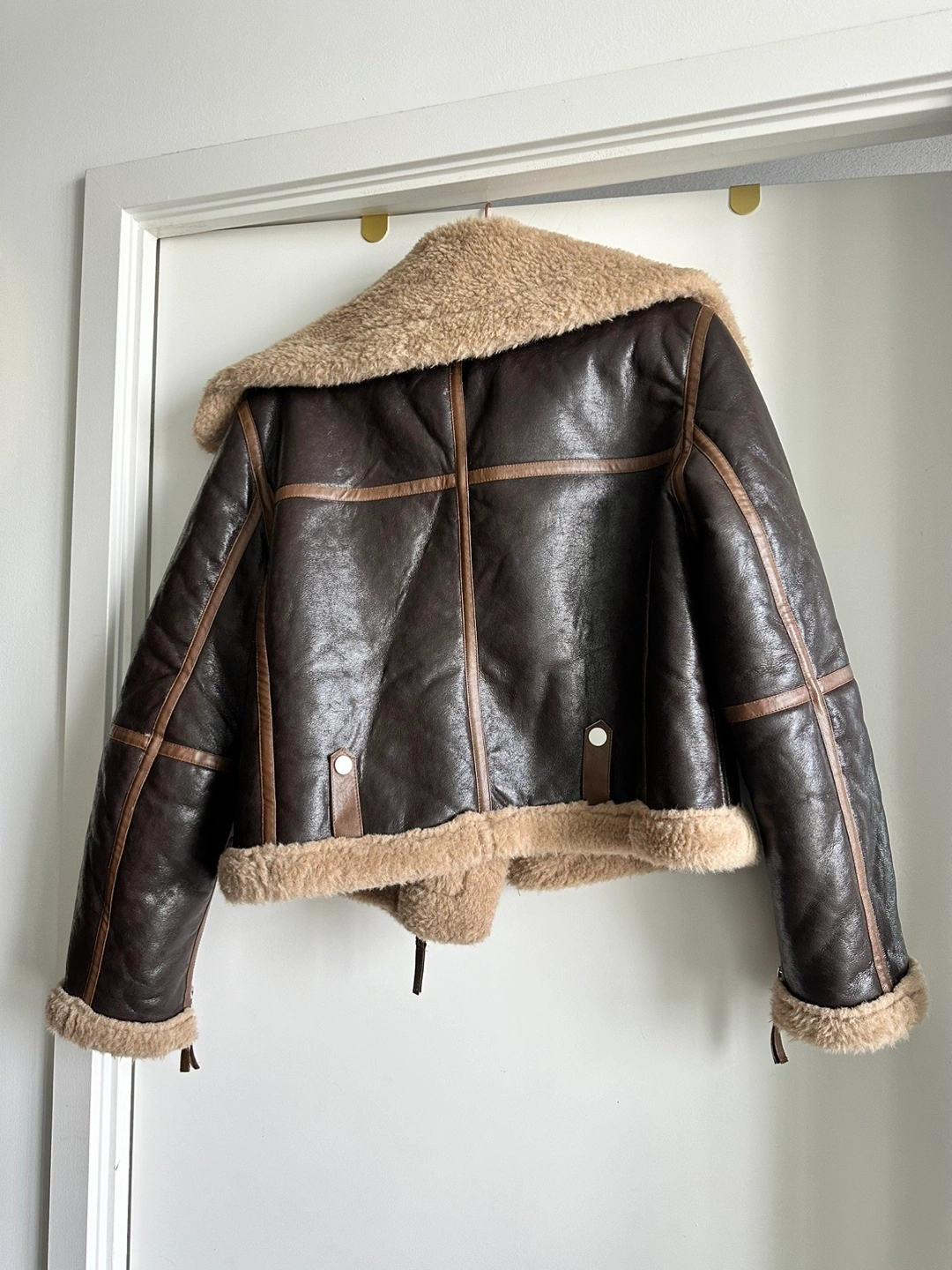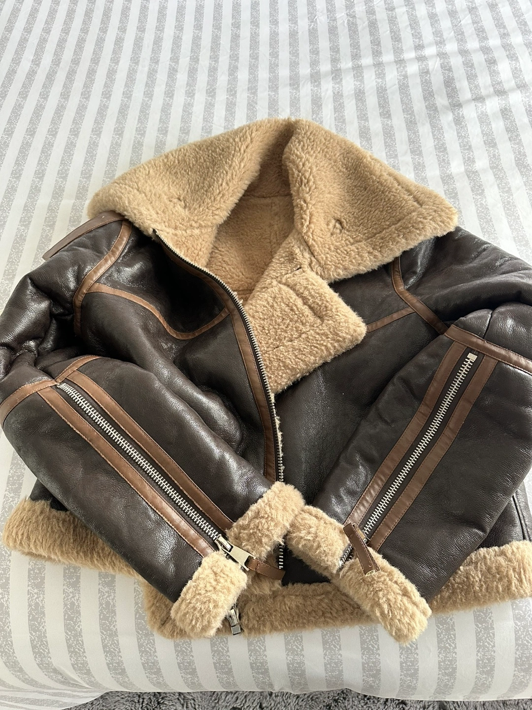 584The classic-fit biker/shearling style jacket is crafted in lamb leather and wool. Finished with a dropped shoulder - oversized looked but no pocket. Can be worn as over-size, and keep you warm in the winter. 100% Leather and wool lining; Trim is Faux Leather; please see photos for details. Long-sleeve; zipper closure. Asian size: 2XL Bust: 55cm Waist: 56cm Shoulder: 44cm Sleeve: 64cm Length: 52cm