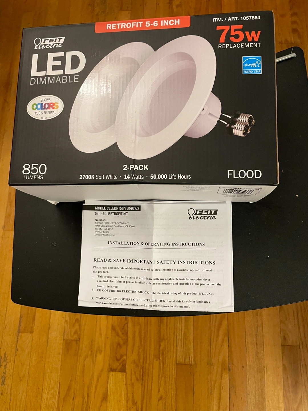 10New, unopened Feit Electric LED dimmable recessed lighting kit. Two 5-6 inch lights included. Replaces 75-watt incandescent bulbs. 850 lumens, 2700K soft white light. 50,000-hour lifespan. Energy Star certified.