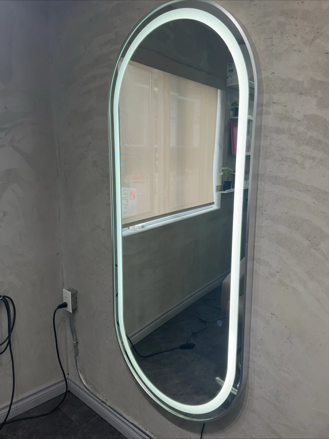 5Brand new Modern arched mirror. Features an LED light around the perimeter. Full-length, perfect for a bedroom or dressing room. Wall mounted. Includes power cord. Please pick up ๐