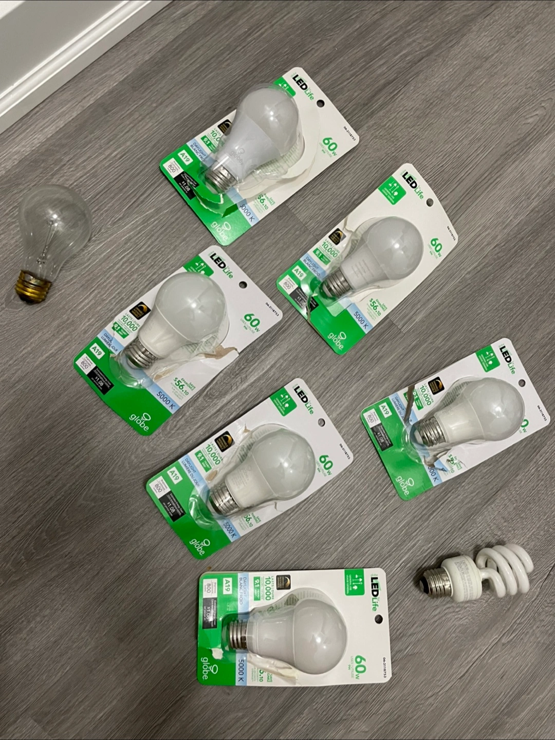 Selling a pack of LED Life 60W light bulbs. There are 6 bulbs in total, including a mix of A19 and other styles. These bulbs provide 10,000 hours of daylight at 5000K. Great for brightening up any room!