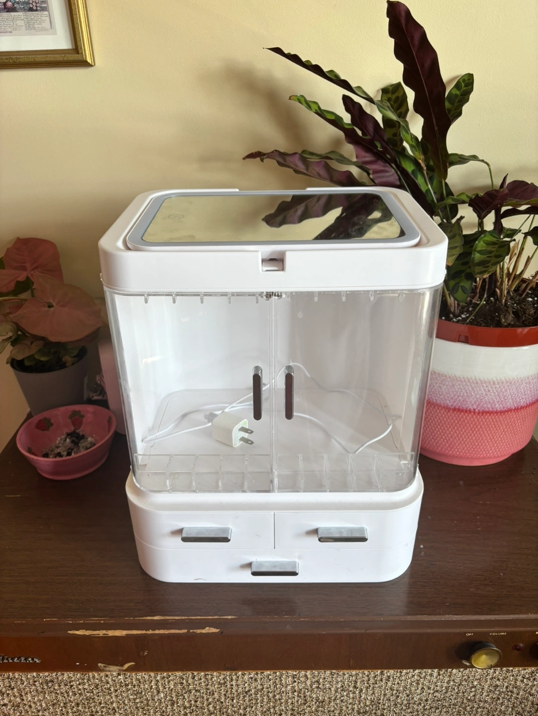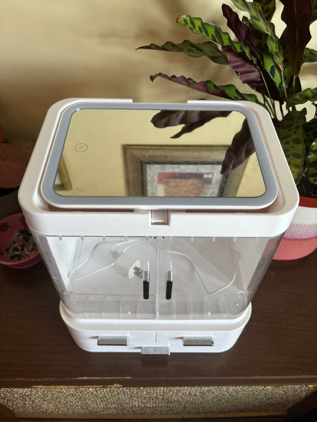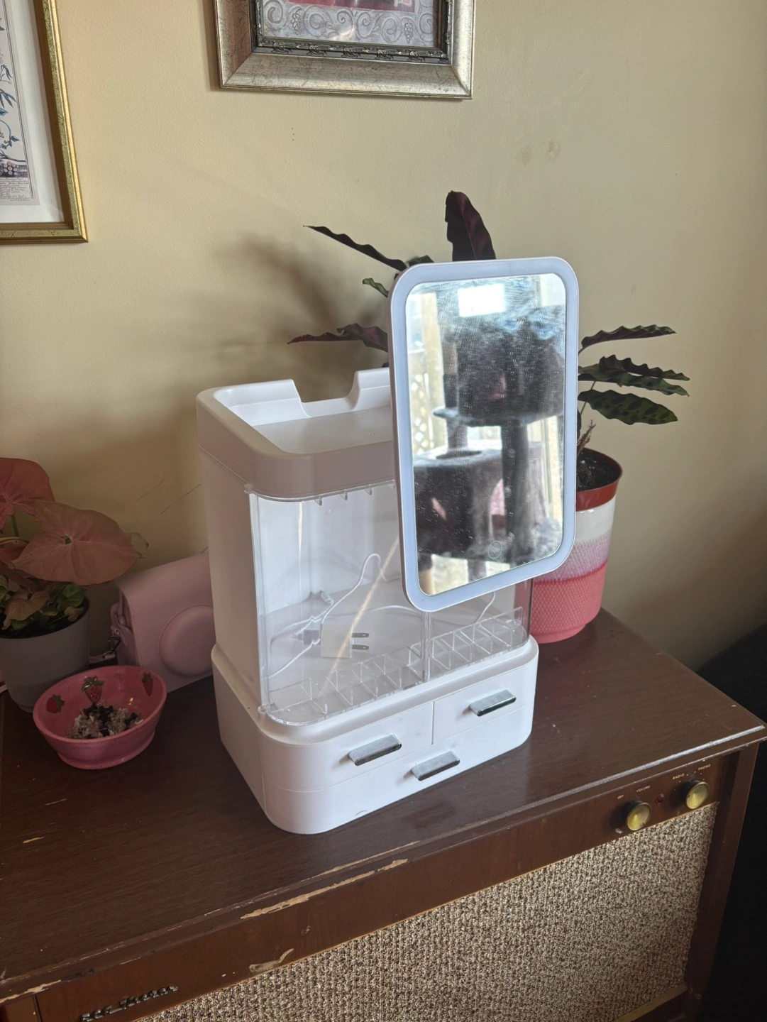 25White plastic organizer. Features a clear compartment with two doors, 3 drawers, and a detachable LED mirror. Perfect for storing makeup and accessories.