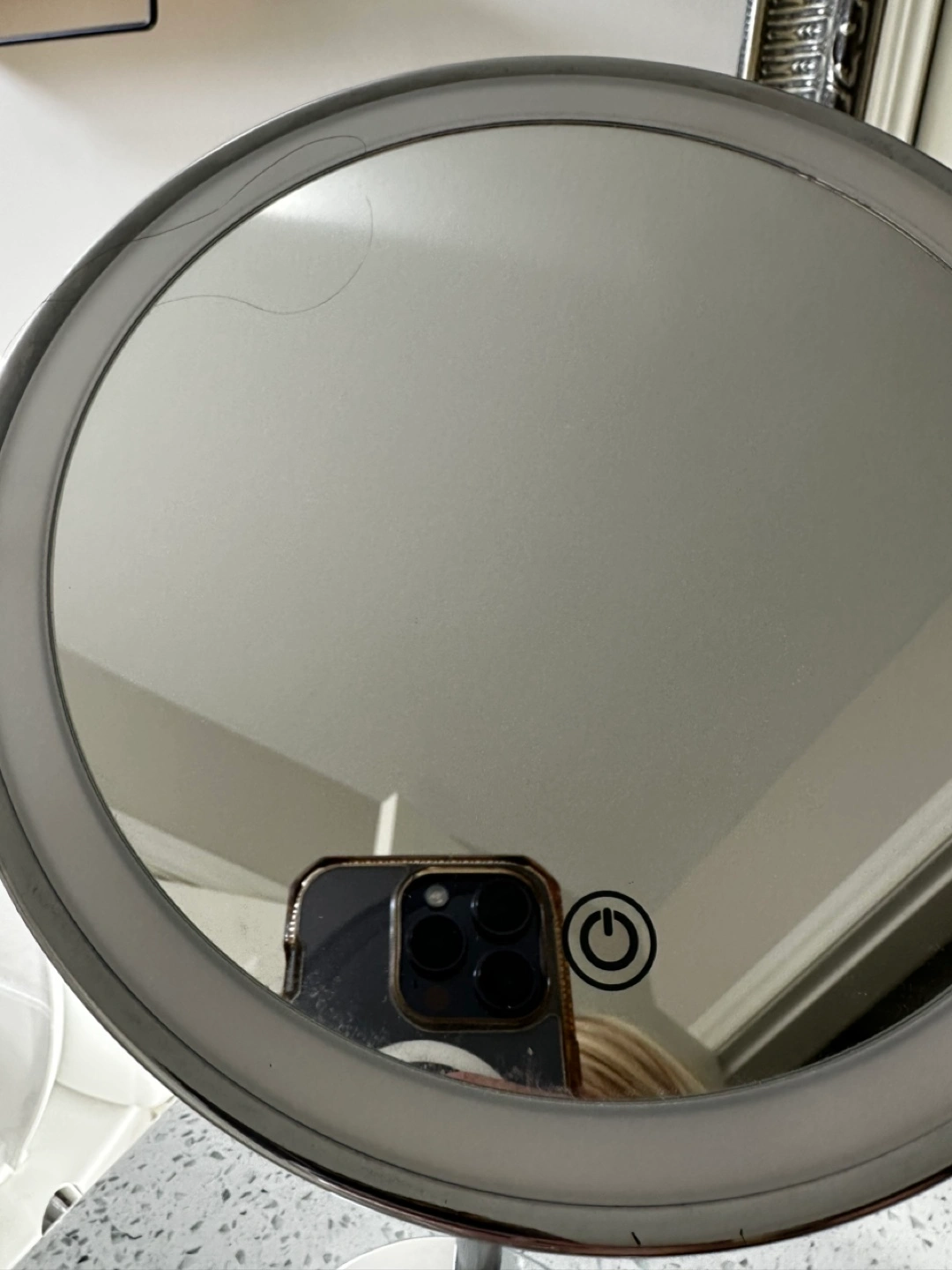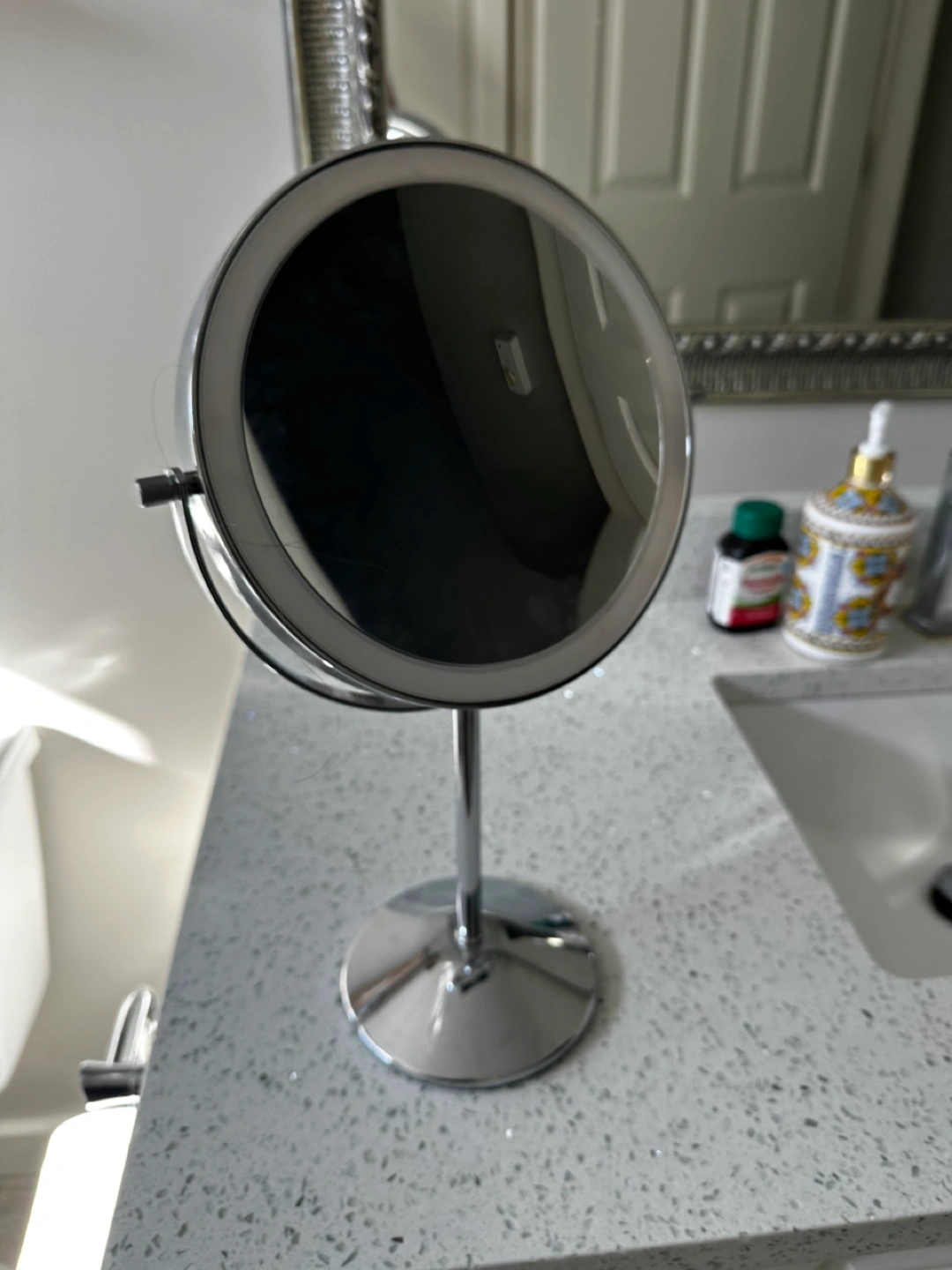 96Chrome-finish tabletop mirror. Features an LED light and adjustable stand. Great for makeup application. Needs to be plugged into usb. Changes colour when lit up with press of a button.