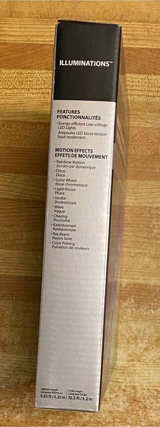 252Energy-efficient low-voltage LED lights. Have fun alternating between 10 different motion effects. - Rainbow Motion - Disco - Color Wheel - Light House - Strobe - Wave - Chasing - Kaleidoscope - Ray Beam - Color Pulsing Lighted Length: 0.83 ft / 0.25 m Total Length: 10.5 ft / 3.2 m