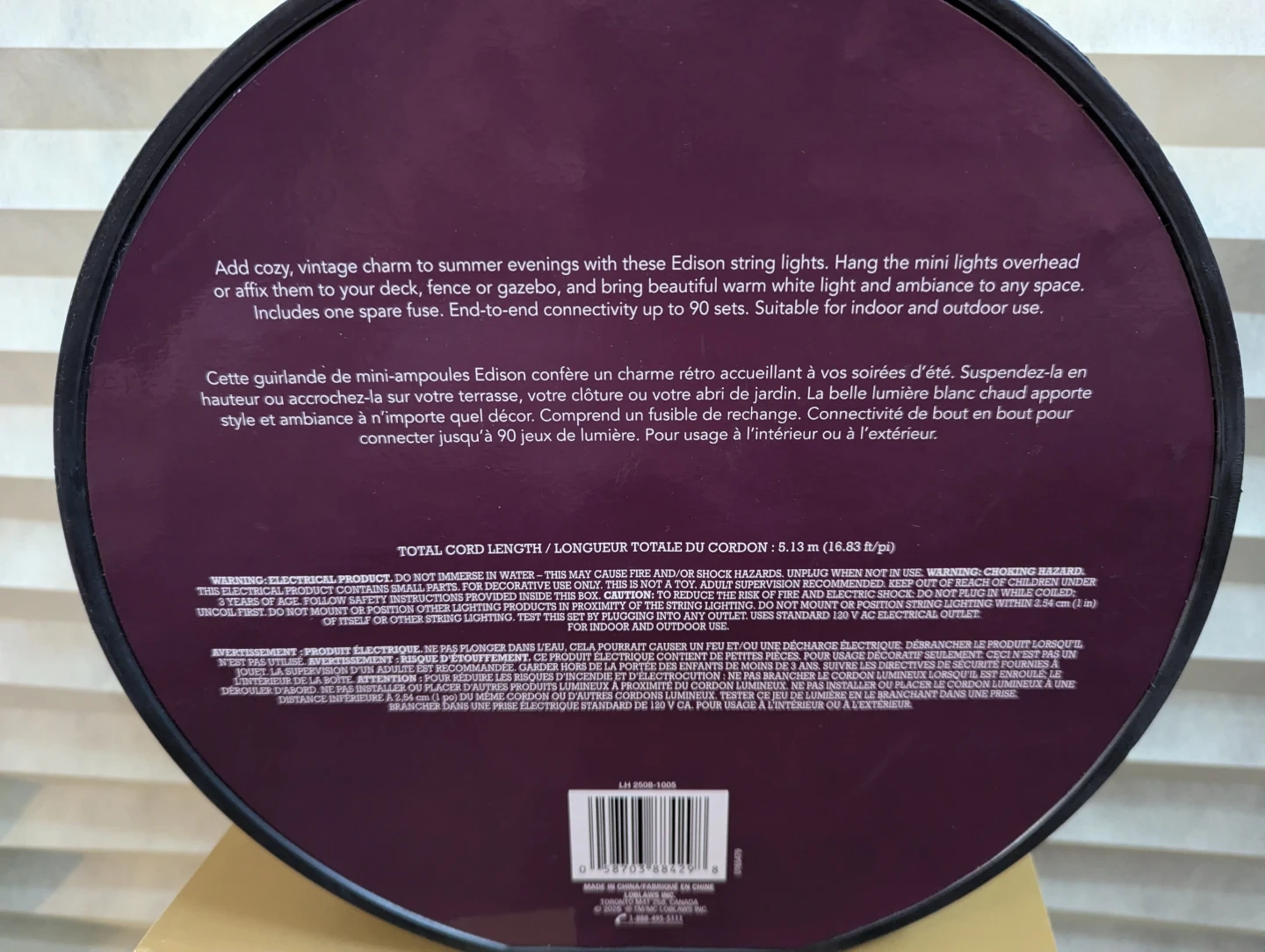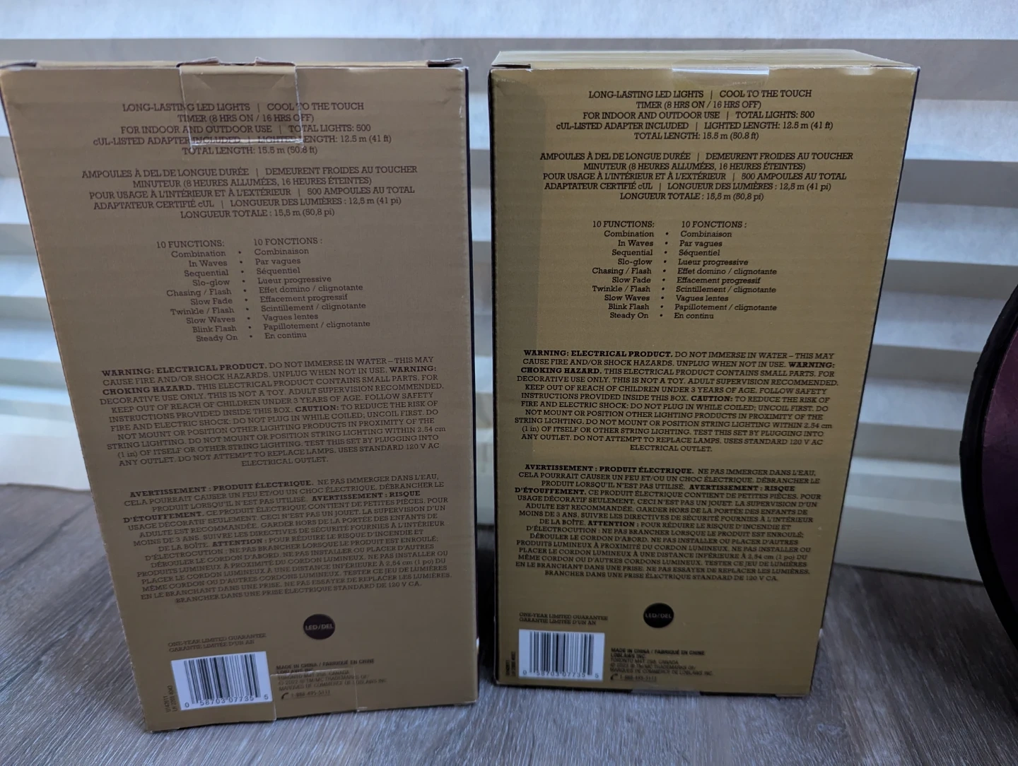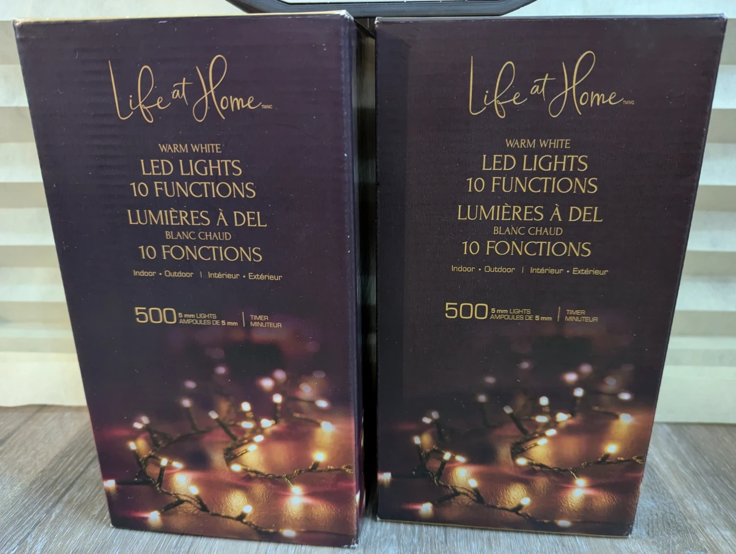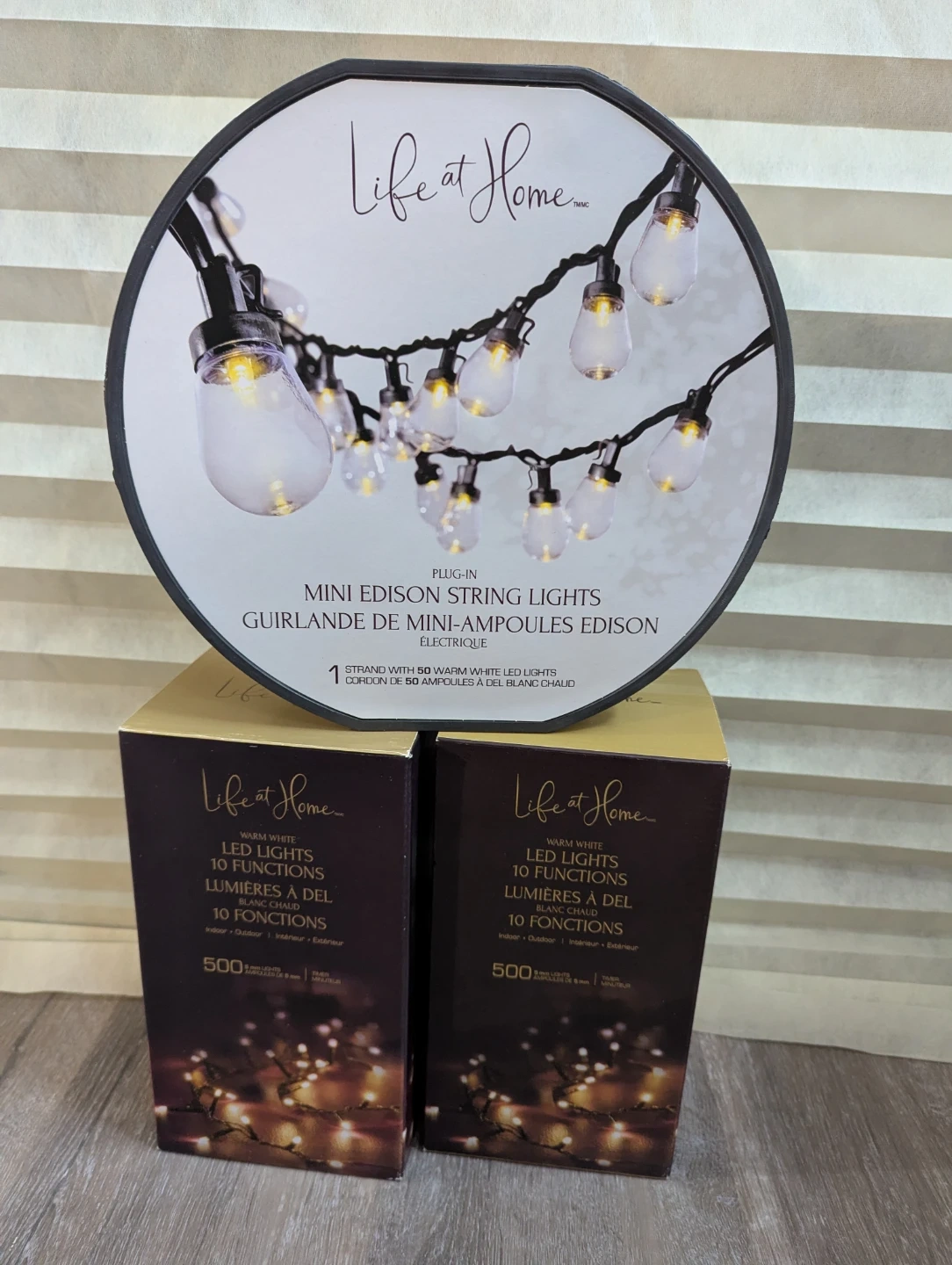 152Brand new set! - 1strand Life at Home plug in mini Edison string lights with 50 warm white led lights 5.3 meters length, indoor/outdoor . - 2 boxes: Life at Home warm white 500 led lights 15.5 meters length, 10 functions, indoor/outdoor, plug in. Pickup only