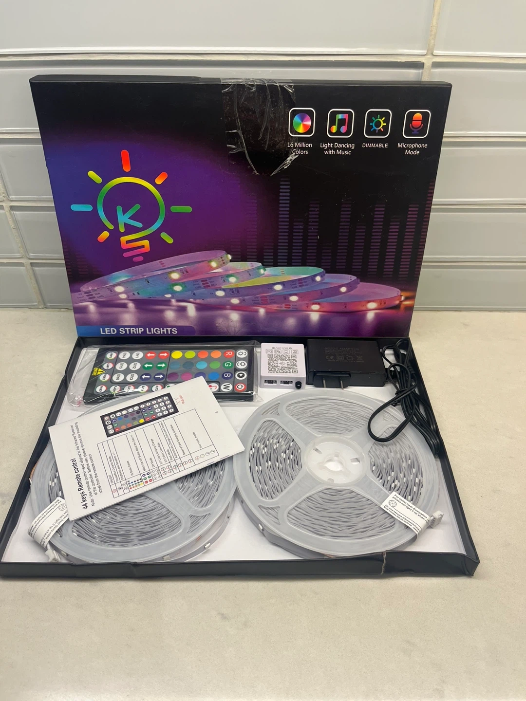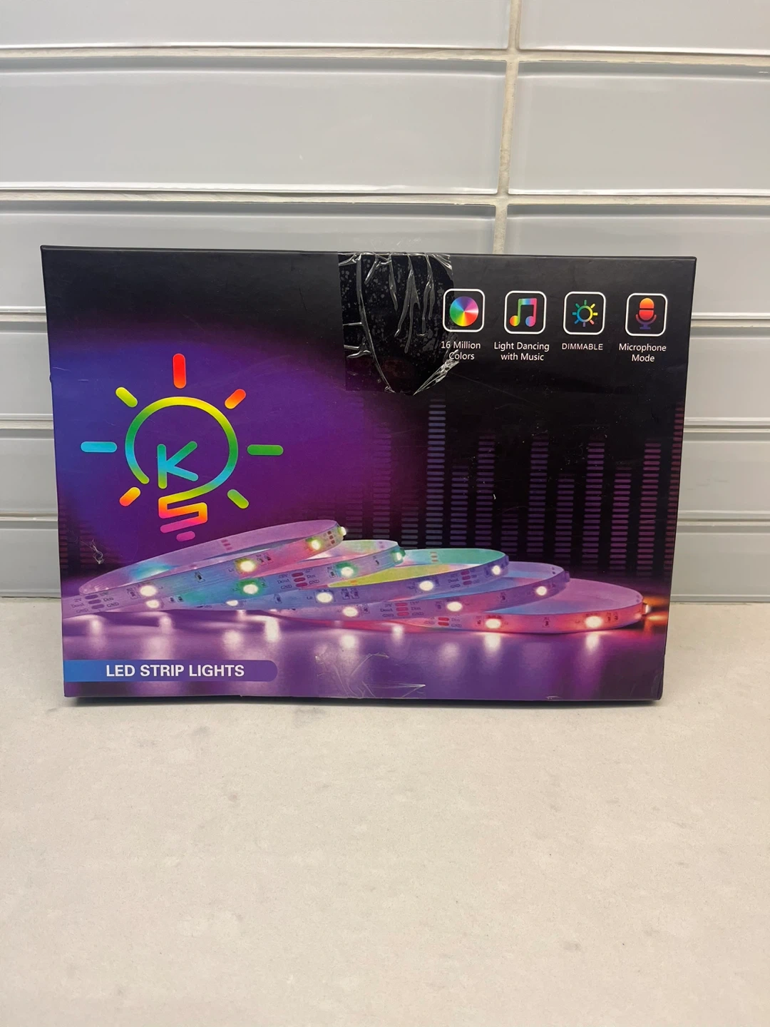 Add some vibrant lighting to your space with these LED strip lights! They feature 16 million colours, light dancing with music, dimmable settings, and a microphone mode. The box is included and contains the remote control, the power adapter, and instructions