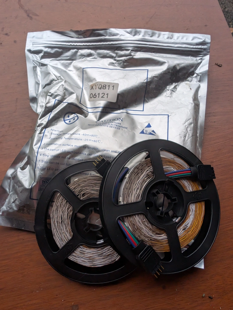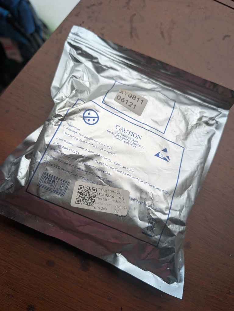 60Selling a set of LED strip lights, still in their original packaging. The packaging includes caution information regarding moisture and static sensitive devices. The installation surface should be smooth, clean, and dry. The strips can be cut following the cutting lines for a custom fit