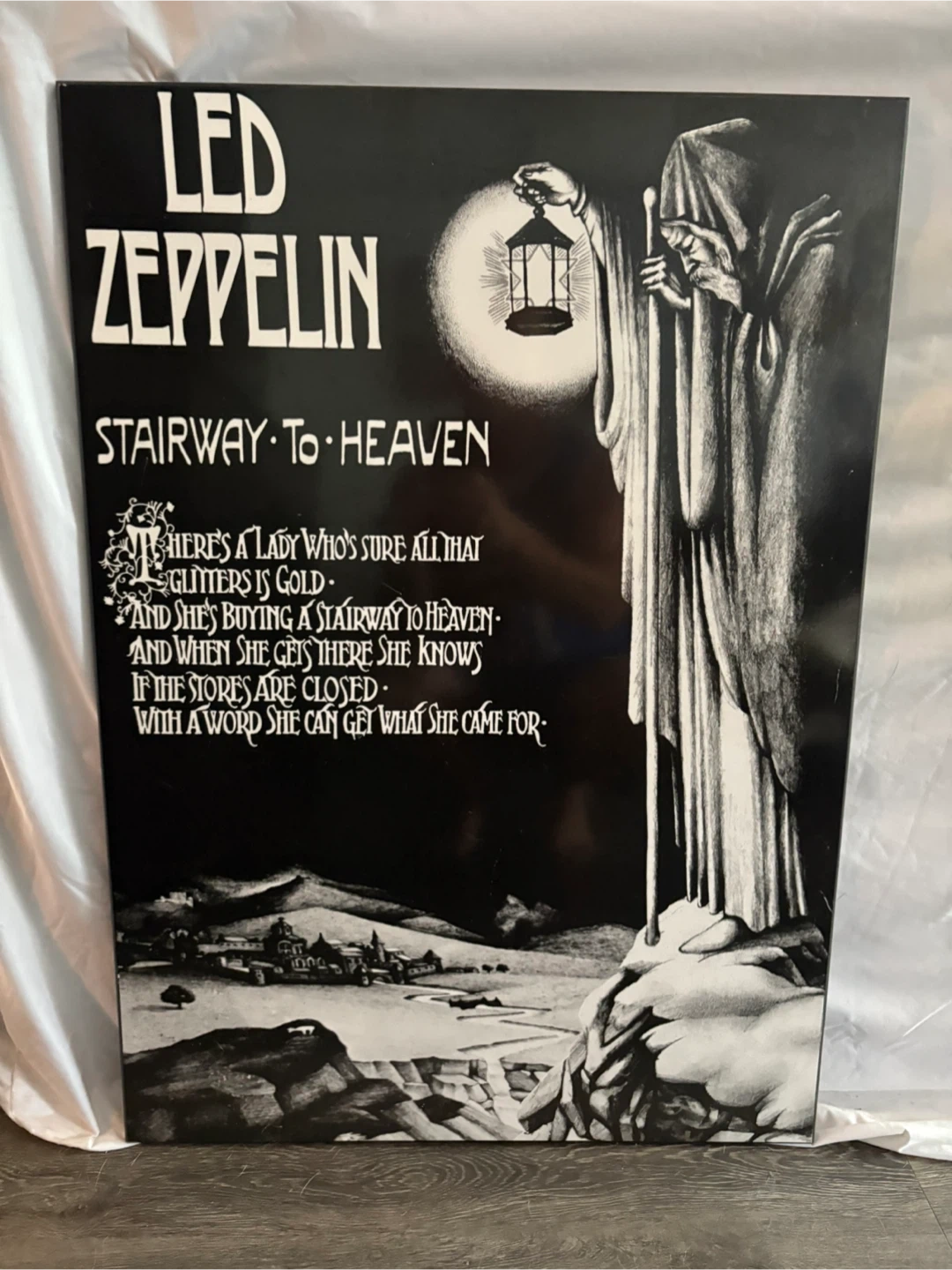 Selling a Led Zeppelin 'Stairway to Heaven' wood mounted poster. It features the iconic imagery and lyrics from the song. Perfect for any fan! $30!