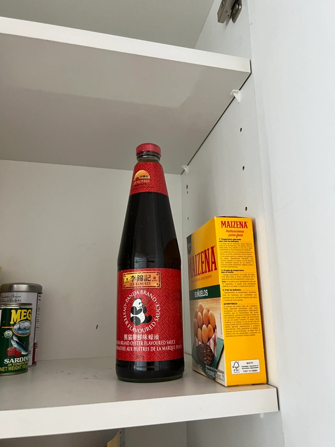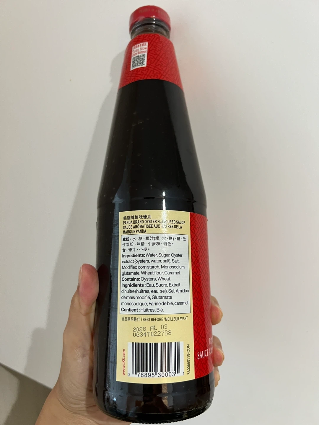 Selling a bottle of Lee Kum Kee Panda Brand Oyster Flavoured Sauce. It contains water, sugar, oyster extract, salt, modified corn starch, and caramel. Best before 2028 August 03