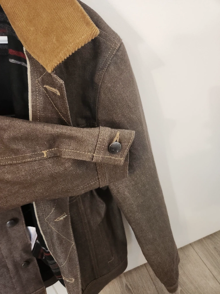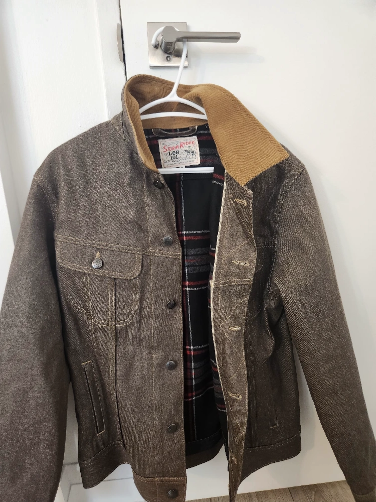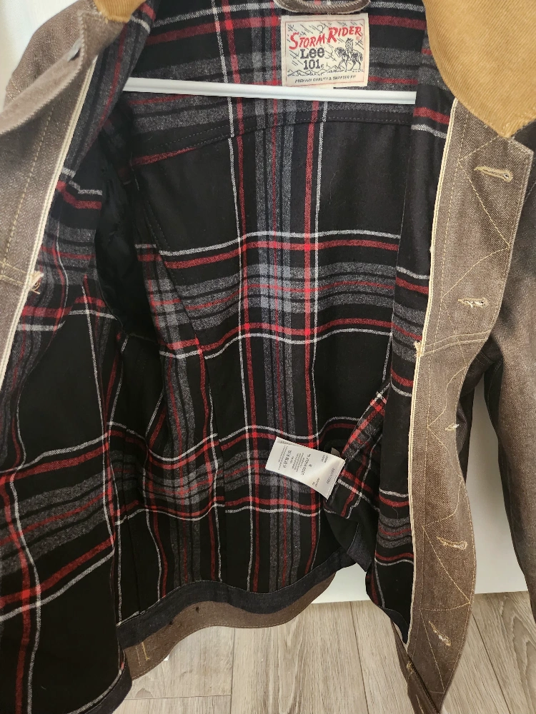 12Selling a Lee Storm Rider jacket! It's a brown denim jacket with a corduroy collar and a plaid lining. Great for layering during the cooler months! never worn but no tags