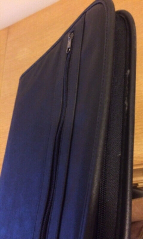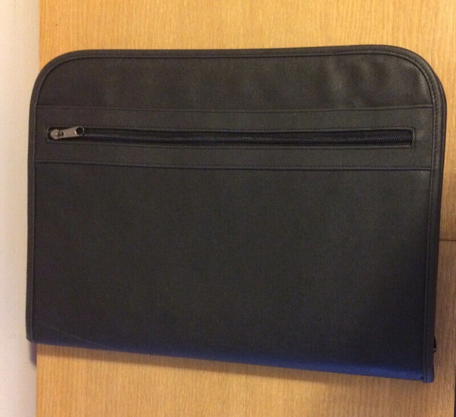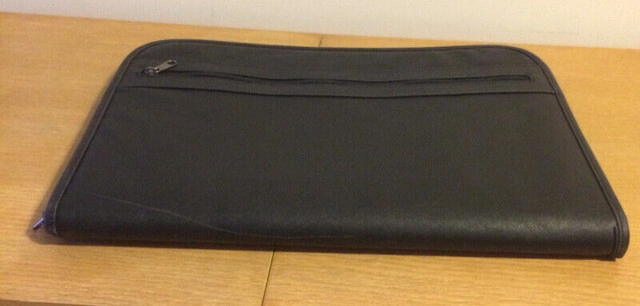 Portfolio case for sale. Black. Zippered, external zippered pocket, lots of internal pockets, paper notepad, pen holder. Logo on inside. Scratch on bottom and slight wear inside by zipper. About 16x12x1”, holds legal-size paper. Professional-looking and handy for protecting your resume and portfolio at job interviews, holding business documents and office supplies on the go, meetings, conferences, and more. $15. Near the Burlington/Oakville border. Cashless payment accepted.