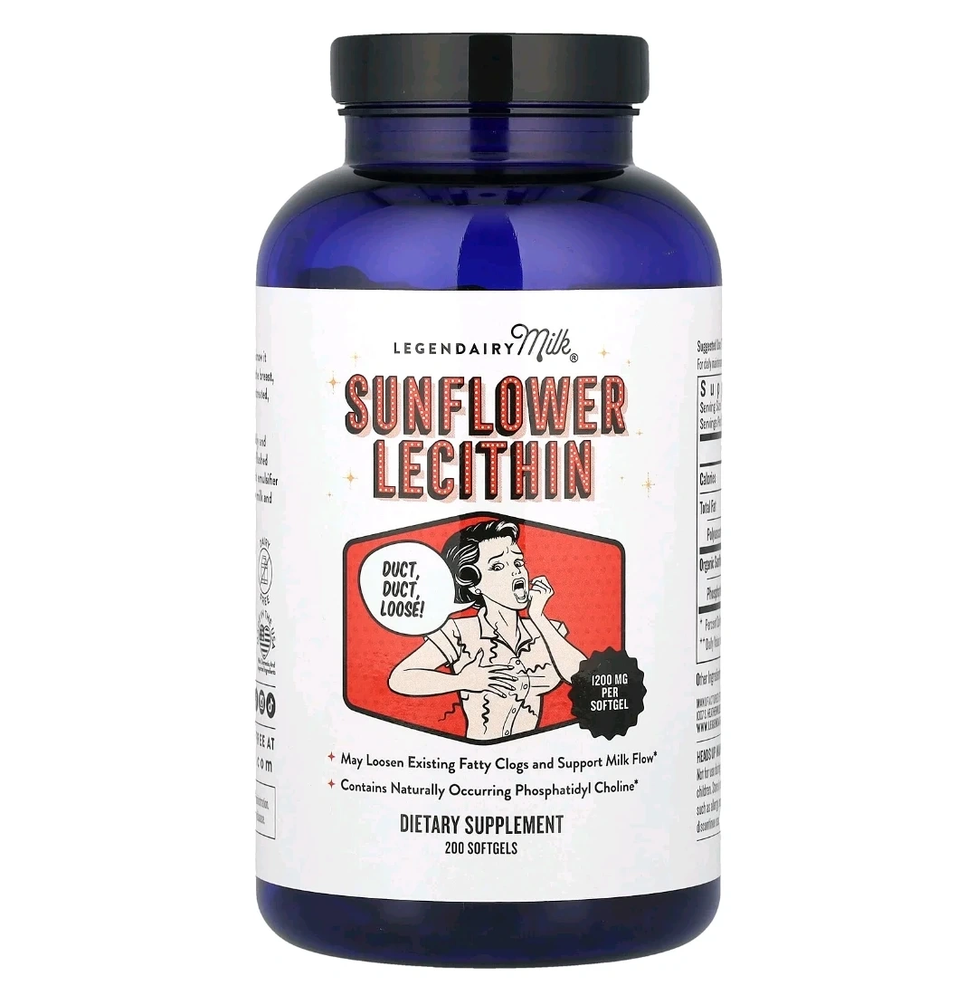 28Selling a bottle of Legendairy Milk Sunflower Lecithin dietary supplement, containing 200 softgels. I used a bottle before this and bought a second one just in case but never ended up using it. The bottle is sealed and good until March 2027. This supplement helps loosen existing fatty clogs and supports milk flow. Each softgel contains 1200 mg of sunflower lecithin. If you've ever had a plugged duct before, you know it hurts like heck. Once milk gets backed up in the breast, it can quickly become engorged, and if left untreated, develop into the dreaded mastitis. The solution is to get the milk flowing as quickly and completely as possible so the blockage can be flushed out. Sunflower Lecithin is a natural fat emulsifier that can help to reduce the "stickiness" of the milk and deter fats from clumping together.