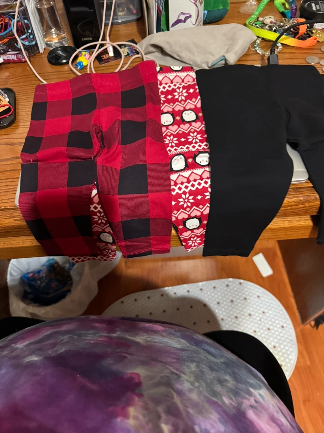 Selling a bundle of leggings! There's a pair with a red and black buffalo plaid pattern, a pair with a cute penguin and snowflake design, and a solid black pair. They're in great condition and ready for a new home!