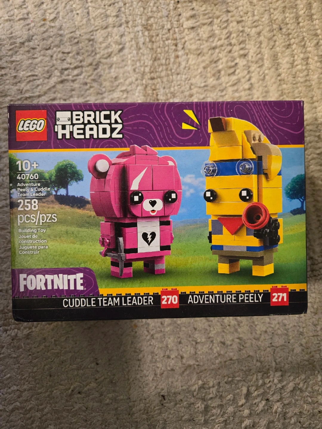 10Selling an UNOPENED LEGO BrickHeadz set featuring Fortnite's Cuddle Team Leader and Adventure Peely! This set is number 40760 and is suitable for ages 10+. It contains 258 pieces to build both characters. A fun building toy for any Fortnite fan!