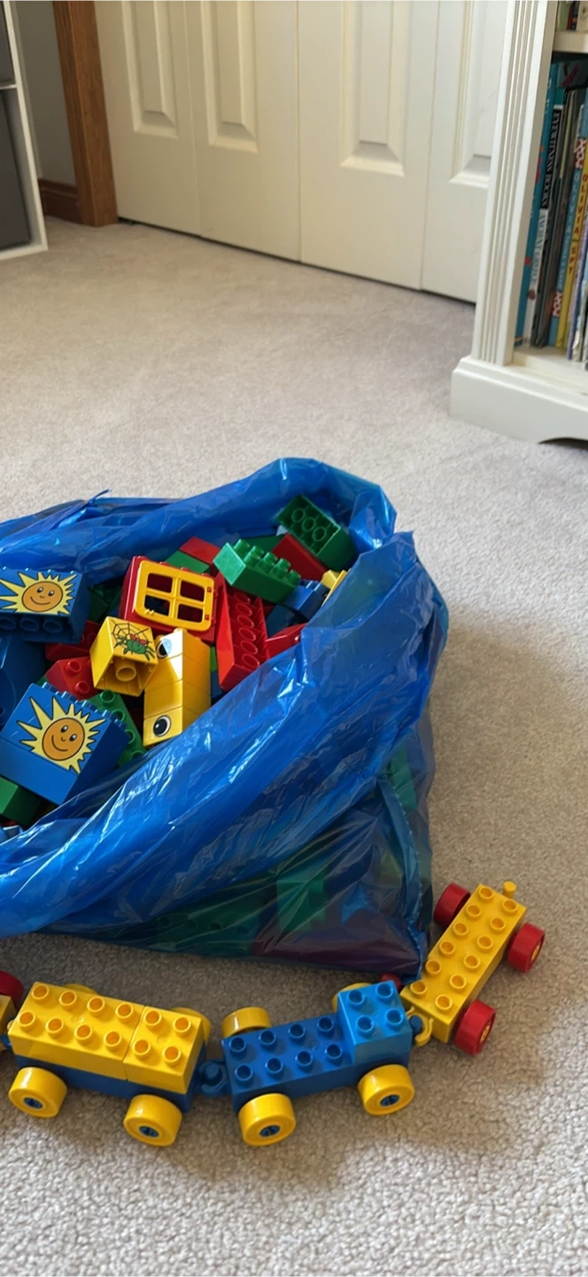 443A big bag of Lego Duplo blocks! Great for toddlers and young children who love to build and create. Lots of different colours and shapes, including some train cars and blocks with fun faces!