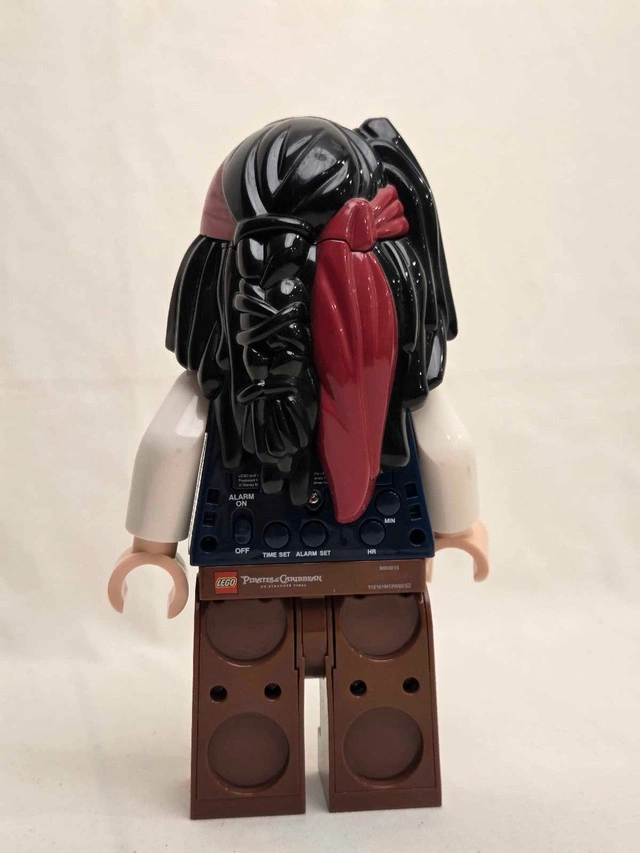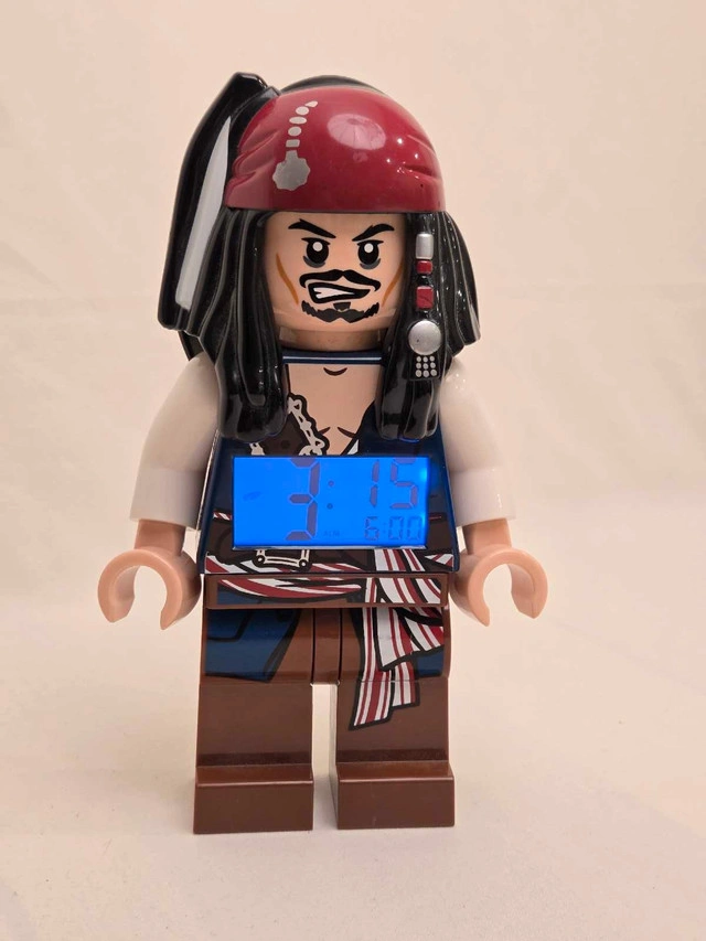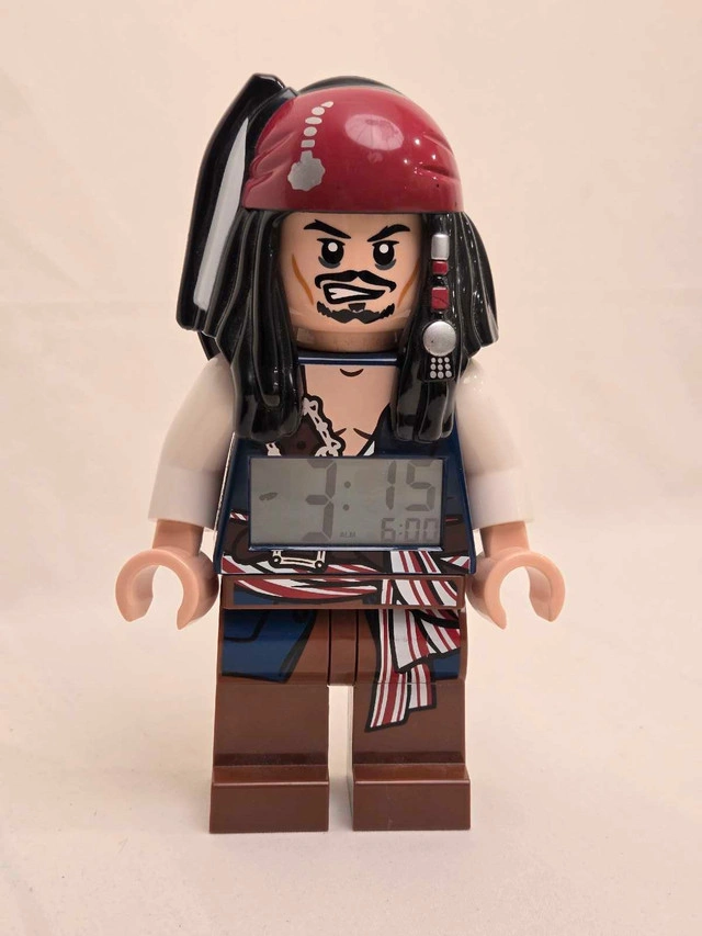 Tick-tock, mateys! This Lego Jack Sparrow clock is ready to add a bit of swashbuckling charm to your bedside table. It's used, but in good condition, ready to keep watch over your dreams of pirate adventures. It is the perfect addition to any Lego collection, adding a touch of whimsy to your daily routine. * Officially licensed Lego product * Digital display with backlight * Alarm function to wake you up for your next adventure * Poseable arms and legs for customizable display Based on similar listings, I'm pricing this timepiece at $100 If this ad be still afloat, the clock be available, savvy?