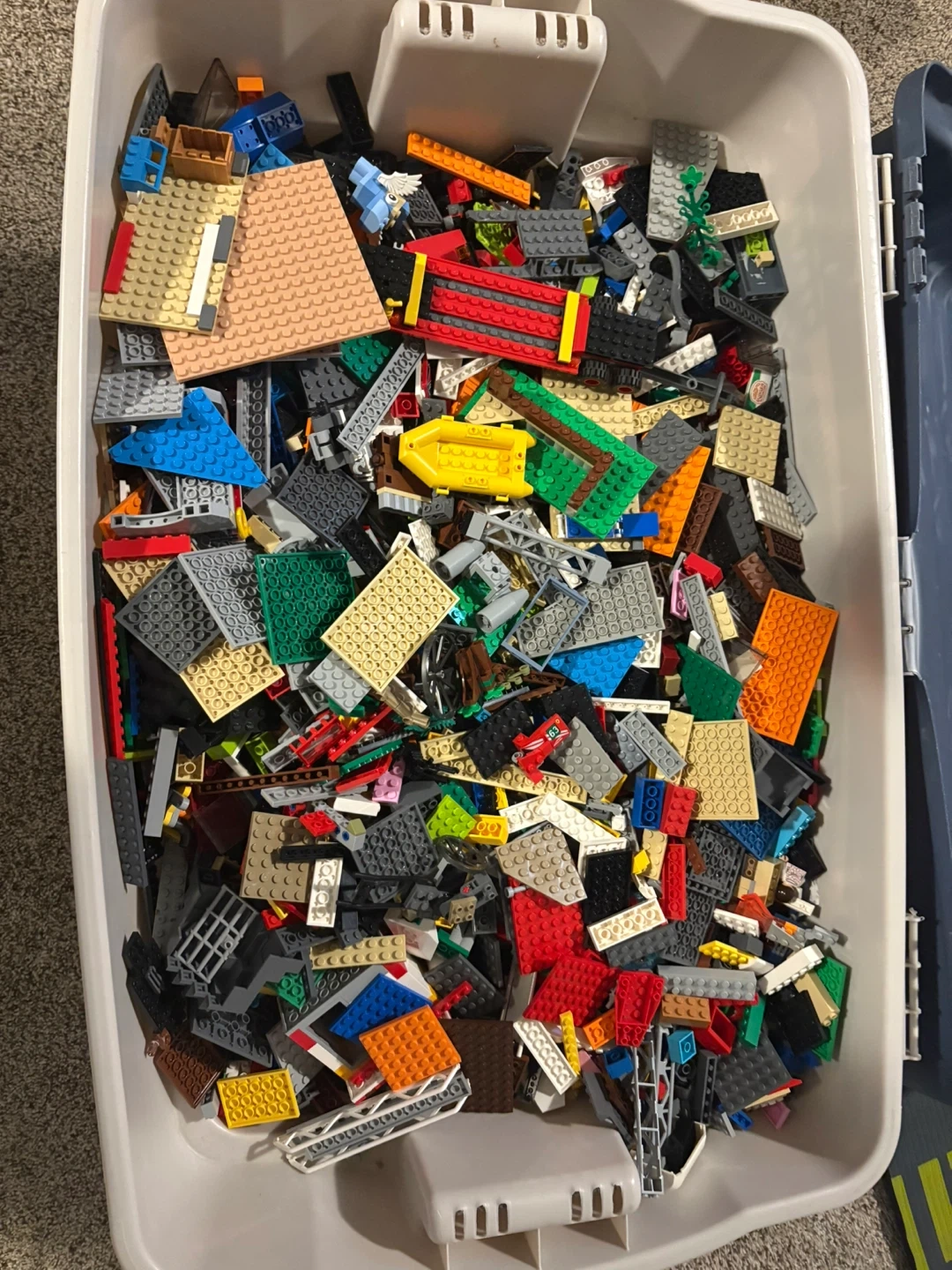 Selling a collection of Lego pieces and assembled structures. It appears to be a mix of different sets, with various buildings and vehicles partially constructed. There's a large bin full of unsorted Lego bricks as well. Perfect for someone who enjoys free building or wants to expand their Lego collection! This great deal also comes with a bin to store your Lego. This includes finished set numbers - 42105 technic sail boat - 31131 noodle shop - 60203 ski resort - 31118 surfer beach house Also includes some road plates Please contact if interested, price negotiable!