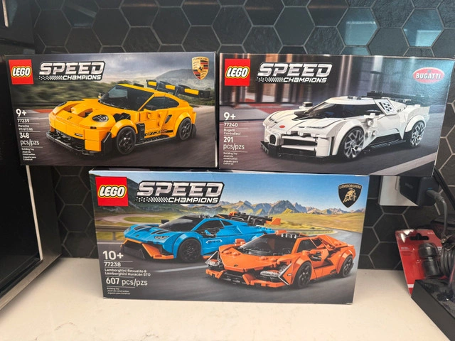 Selling a collection of new, in-box Lego Speed Champions sets, perfect for collectors and Lego enthusiasts alike. These sets feature iconic cars with detailed designs. Included in this lot are: - Lego Speed Champions Porsche 911 Turbo 3.0 (348 pieces) - Lego Speed Champions Bugatti Bolide (291 pieces) - Lego Speed Champions Lamborghini Revuelto and Lamborghini Huracan STO (607 pieces) These sets are all brand new, still sealed in their original boxes, making them ideal for building or keeping as collectibles. I am asking $35 for the Porsche and Bugatti, and $60 for the Lamborghini two pack. But I can do $120 for the lot. Brand new and sealed. Pick up in Mayland Heights. Price is firm unless bought with other items. Check out my other listings for bundle deals. Cash or etransfer is fine. Just a heads-up, if you're seeing this ad, the Legos are still up for grabs, ready to bring some building fun your way!