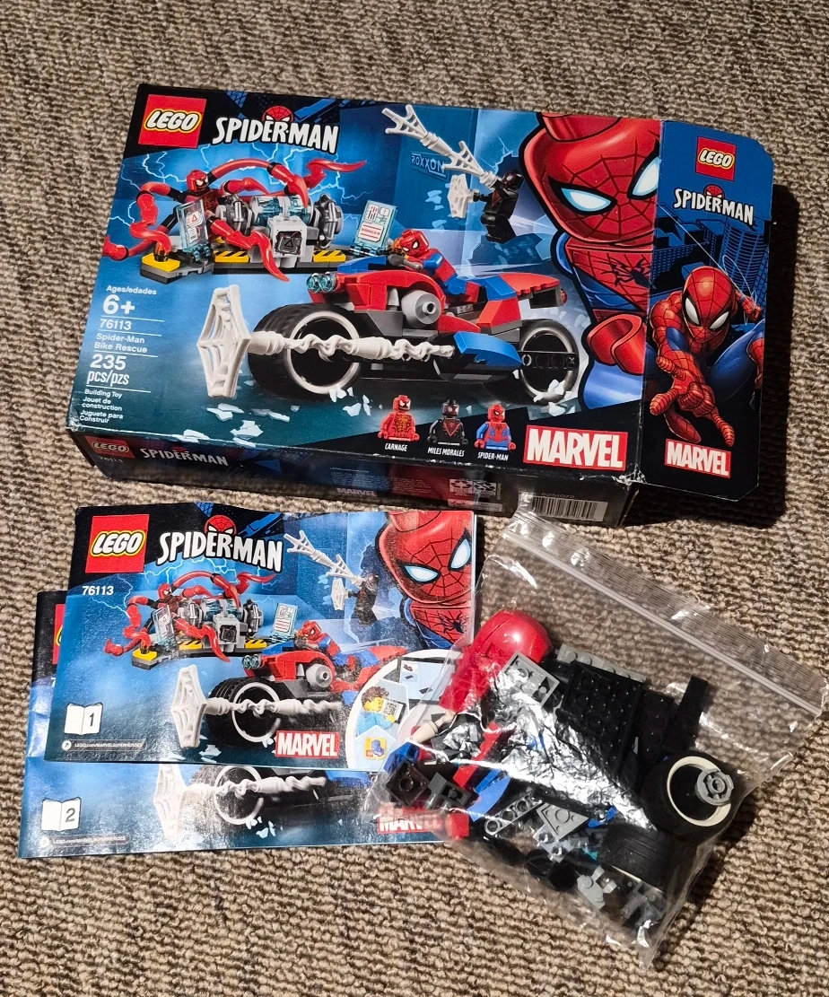 60Selling a LEGO Spiderman Bike Rescue set (76113) for ages 6+. The set includes 235 pieces to build Spiderman's bike and a scene with Carnage. Box and instructions included. Opened/used - 95-100% of pieces there