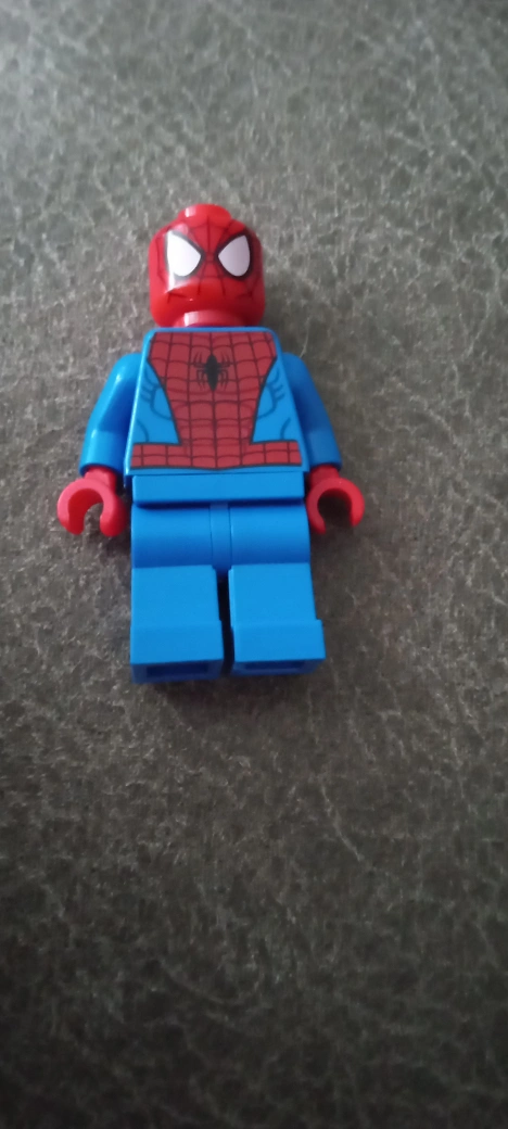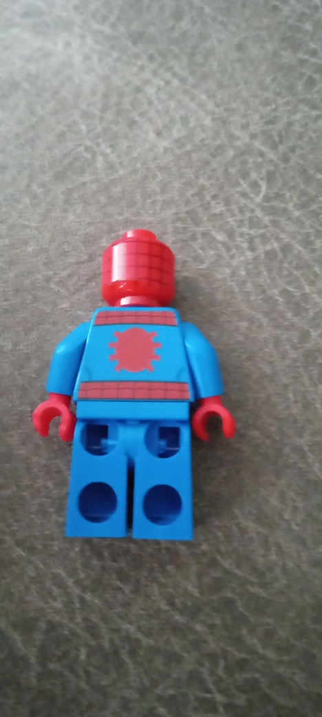 LEGO Spiderman minifigure. Blue legs and red and blue torso. Red head with spider eyes.