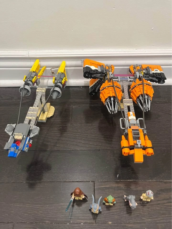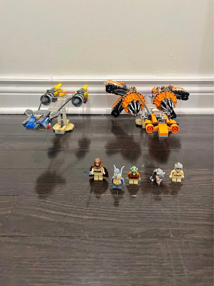 Lego Star Wars Anakin Skywalker and Sebulba's Podracers Disclaimer: I am trying to be accurate when making statements about the set, but if I make some mistakes, forgive me, in the end you get what you see in the picture anyways(The Legos). The Set looks complete but I cannot say I am 100% sure that it is so I will just say 99%. All minifigures are there, the left arm of the minifigures feel a little loose other than then Young Anakin one, Sebulba’ left arm feels very loose but its arm are different than the normal mini-figures, still it feels very loose, the tip of sebulba’s leg( the limb in the middle, an arm maybe?) is broken. No Instructions, Box and Extra Pieces, Pick up on Bernard Avenue and Yonge Street.