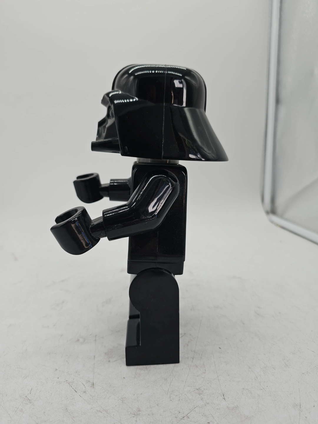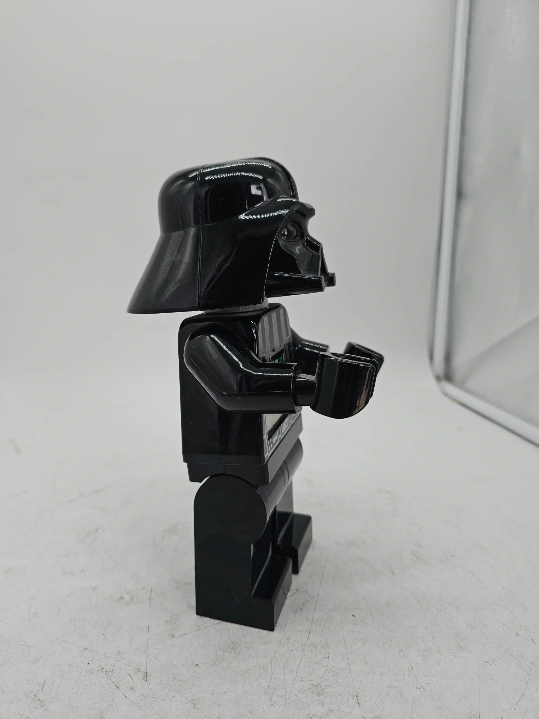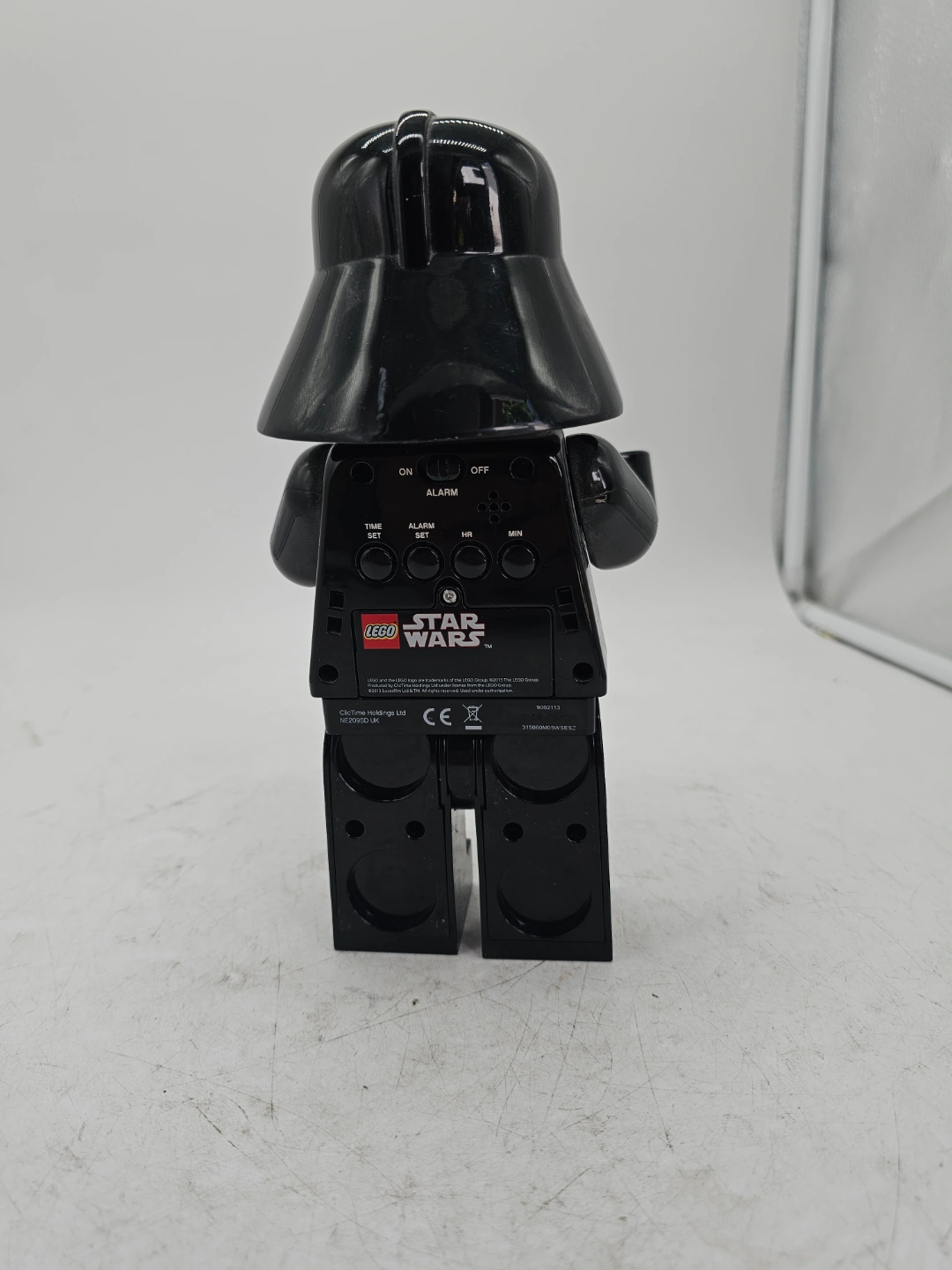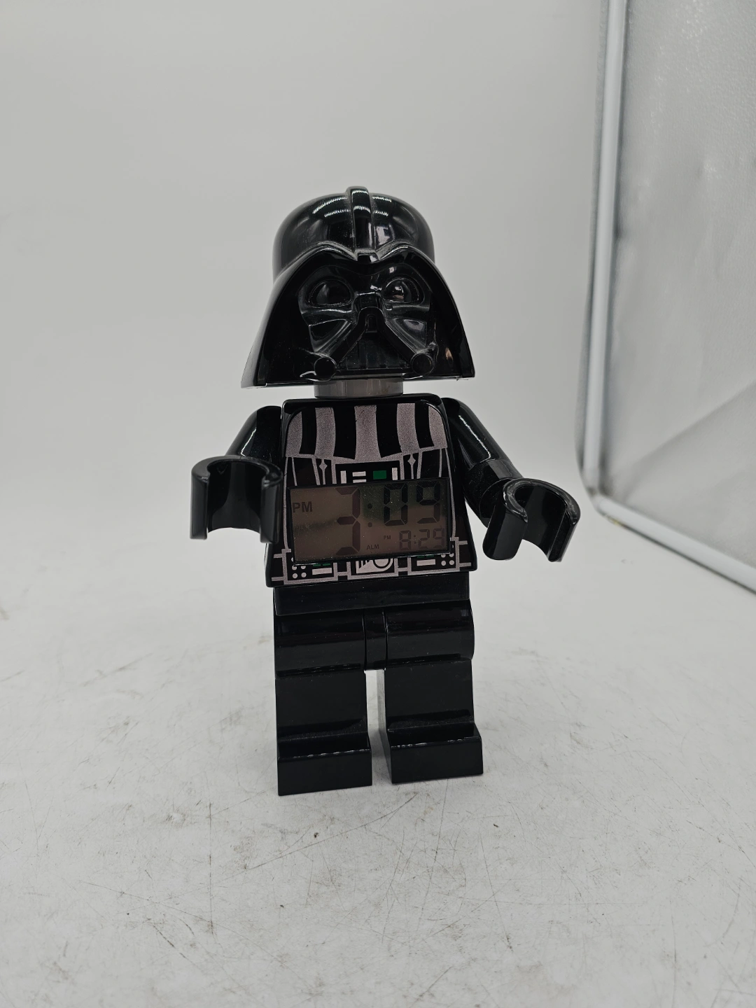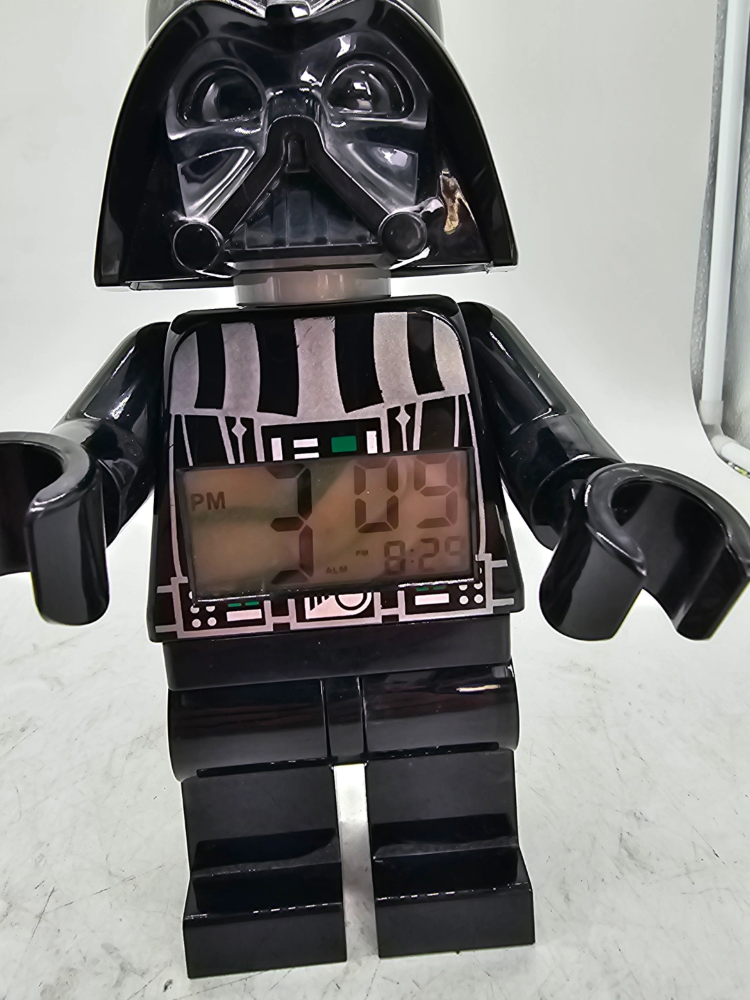 113Darth Vader alarm clock. Shaped like a LEGO minifigure. Features a digital display. Includes alarm functions. Collectible item.
