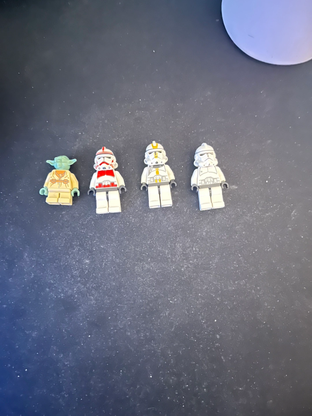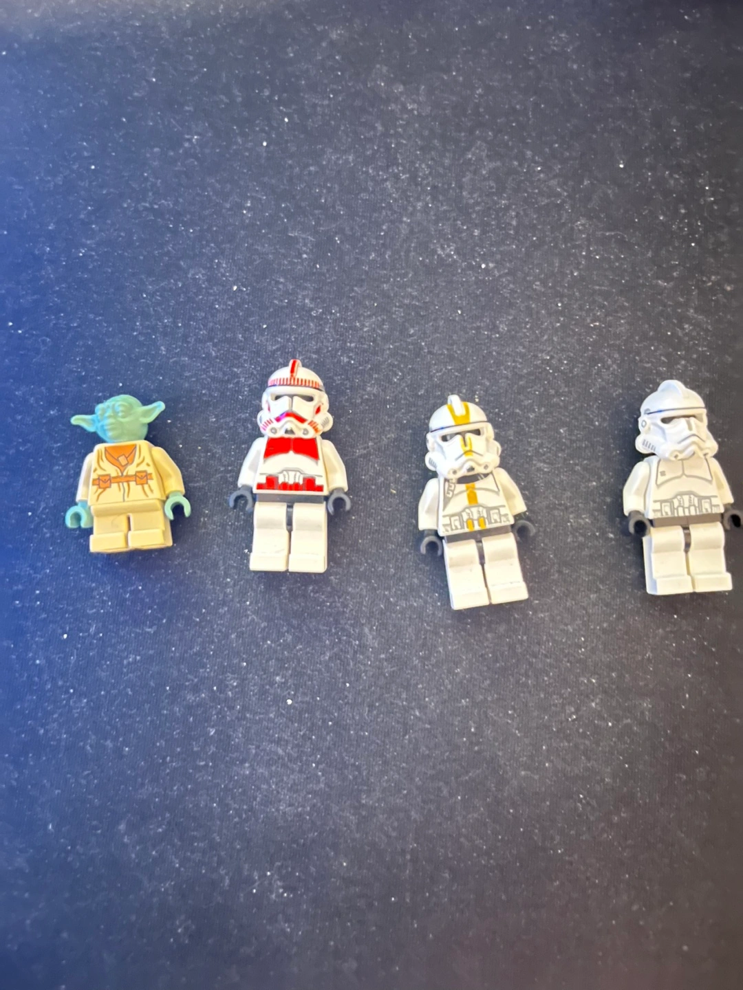 10Four Lego minifigures. Includes Yoda and three different clone troopers. Great addition to any Lego collection.