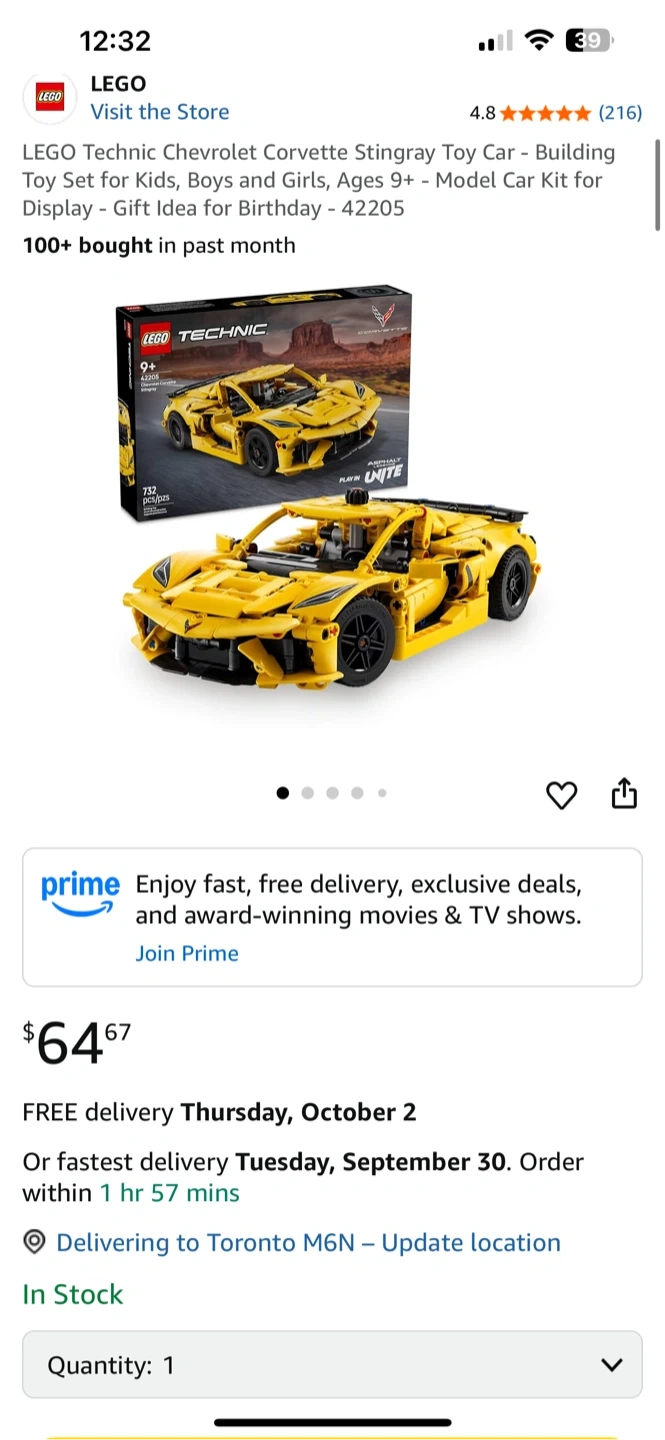 10Selling a brand new LEGO Technic Chevrolet Corvette Stingray set (model 42205)! This building toy car is designed for kids, boys, and girls ages 9+. The set includes 732 pieces to assemble. 64,67$