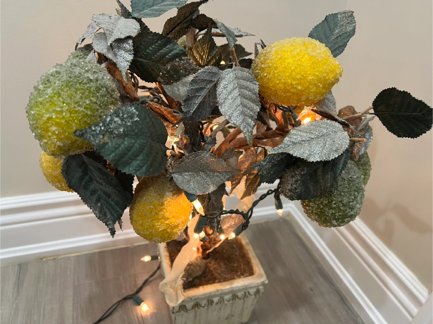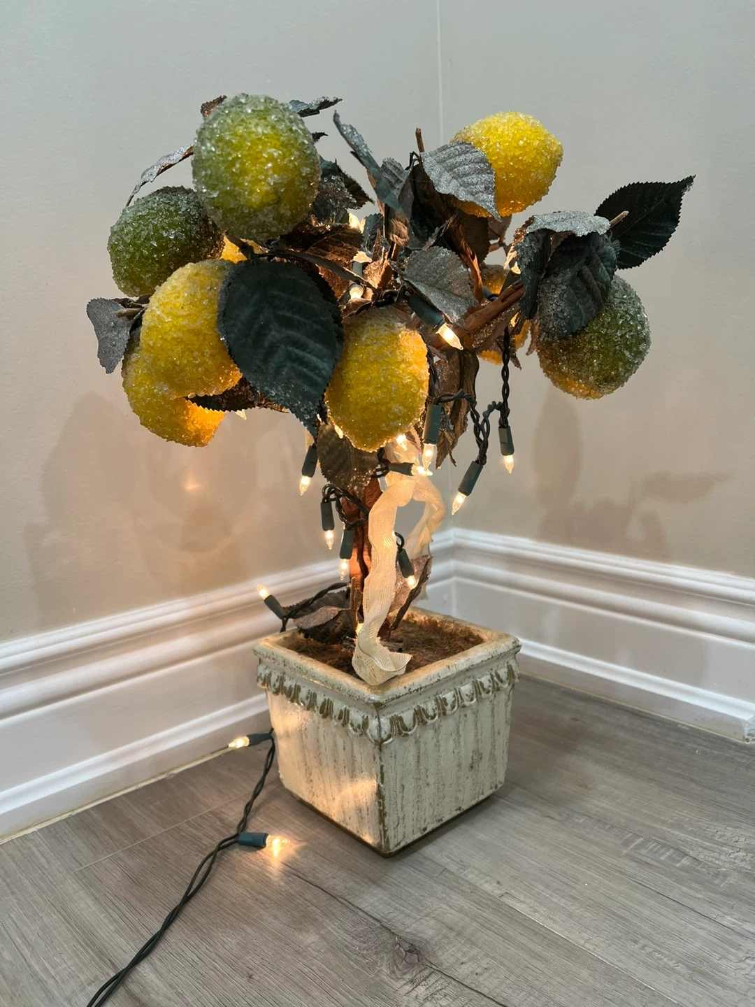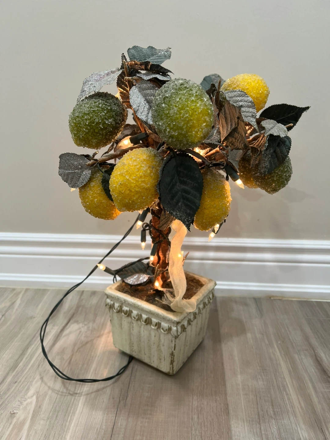 Here's a cute artificial frosted lemon tree decor piece, perfect for adding a touch of brightness to any room! It comes with little lights to create a cozy atmosphere. The lemons are a mix of yellow and green, giving it a realistic look. It's in great condition and ready to brighten up your home! Height 50 cm