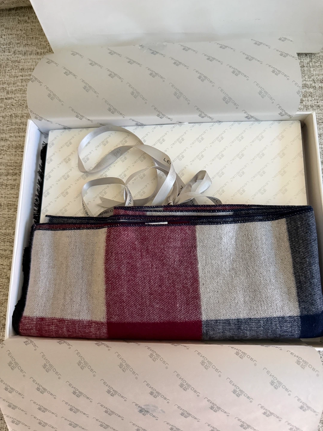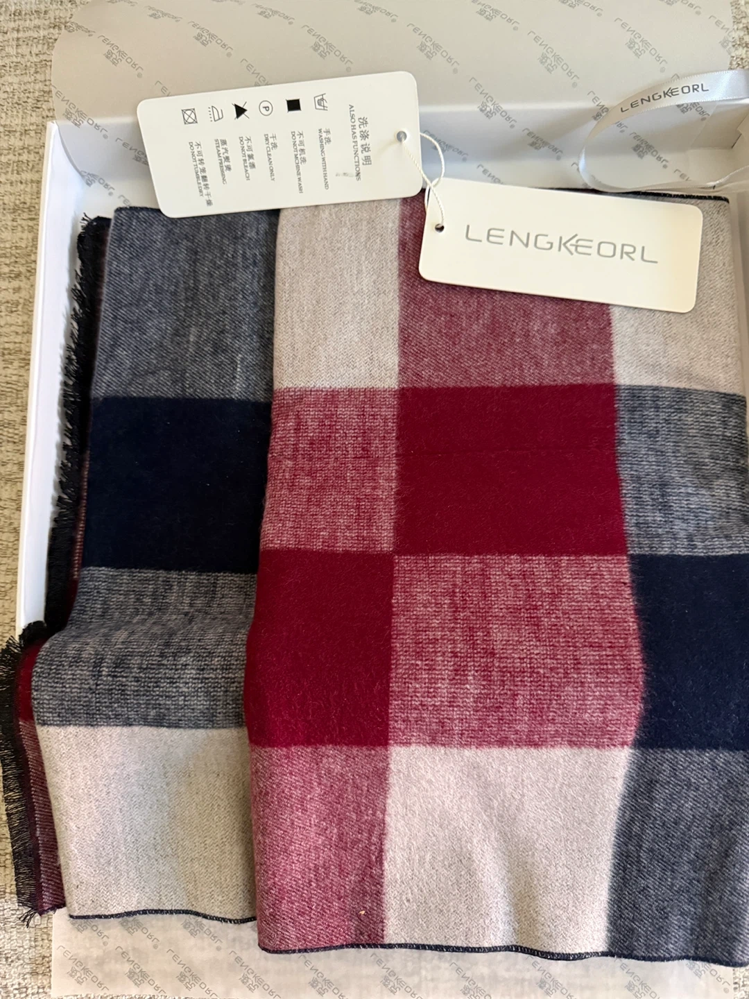 Selling a brand new LENGKEORL scarf, still in its original box! The scarf features a lovely plaid pattern with shades of grey, red, and navy. It's a beautiful accessory to keep you warm and stylish. Comes with the box and bag.