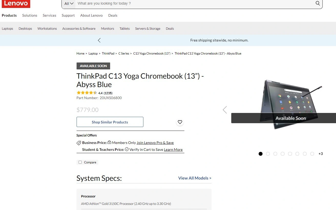 AD IS UP, ITEM IS AVAILABLE......DON'T ASK Processor AMD Athlon™ Gold 3150C Processor (2.40 GHz, up to 3.30 GHz Max Boost, 2 Cores, 4 Threads, 4 MB Cache) Operating System Chrome OS Graphic Card Integrated AMD Radeon™ Graphics Memory 4 GB DDR4 2400MHz (Soldered) Storage 32 GB eMMC (Soldered) Display 13.3" FHD (1920 x 1080) IPS, anti-glare, touchscreen, 300 nits Camera 720p HD & 5 MP World Facing Battery 4 Cell Li-Polymer 51 Wh AC Adapter / Power Supply 65W Pen Lenovo USI Pen Fingerprint Reader None Pointing Device ClickPad + Active Pen Keyboard Backlit - US English WLAN 802.11AC (2 x 2) & Bluetooth® 5.0