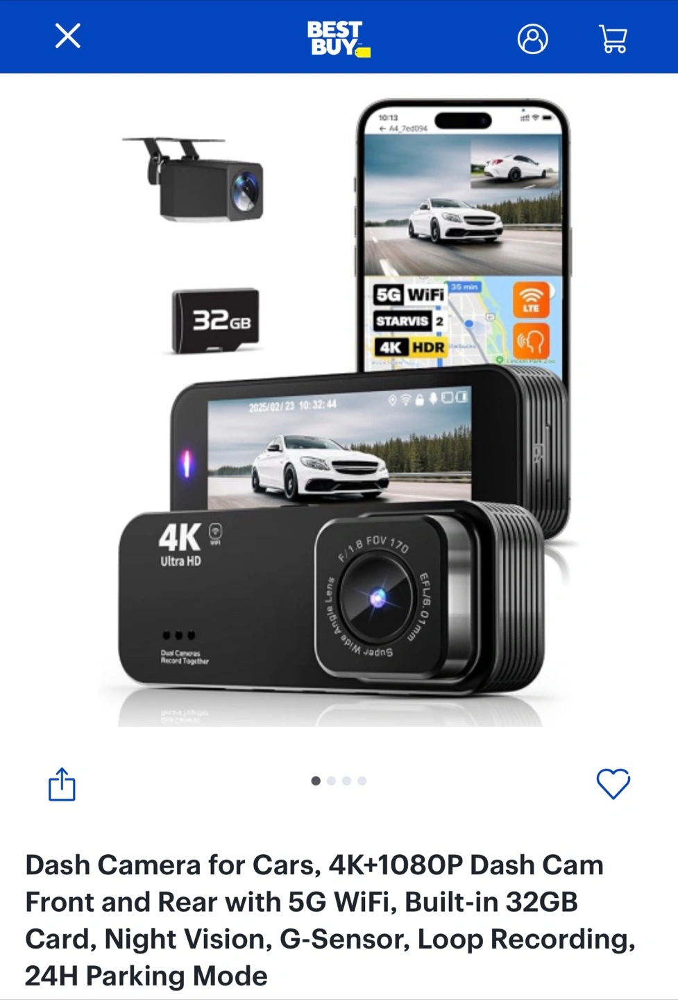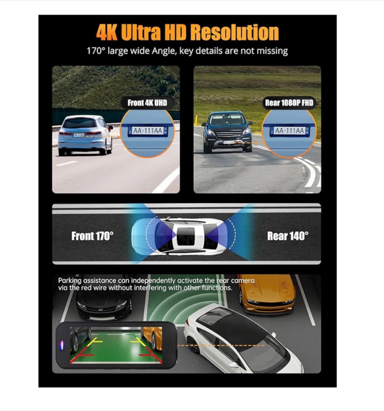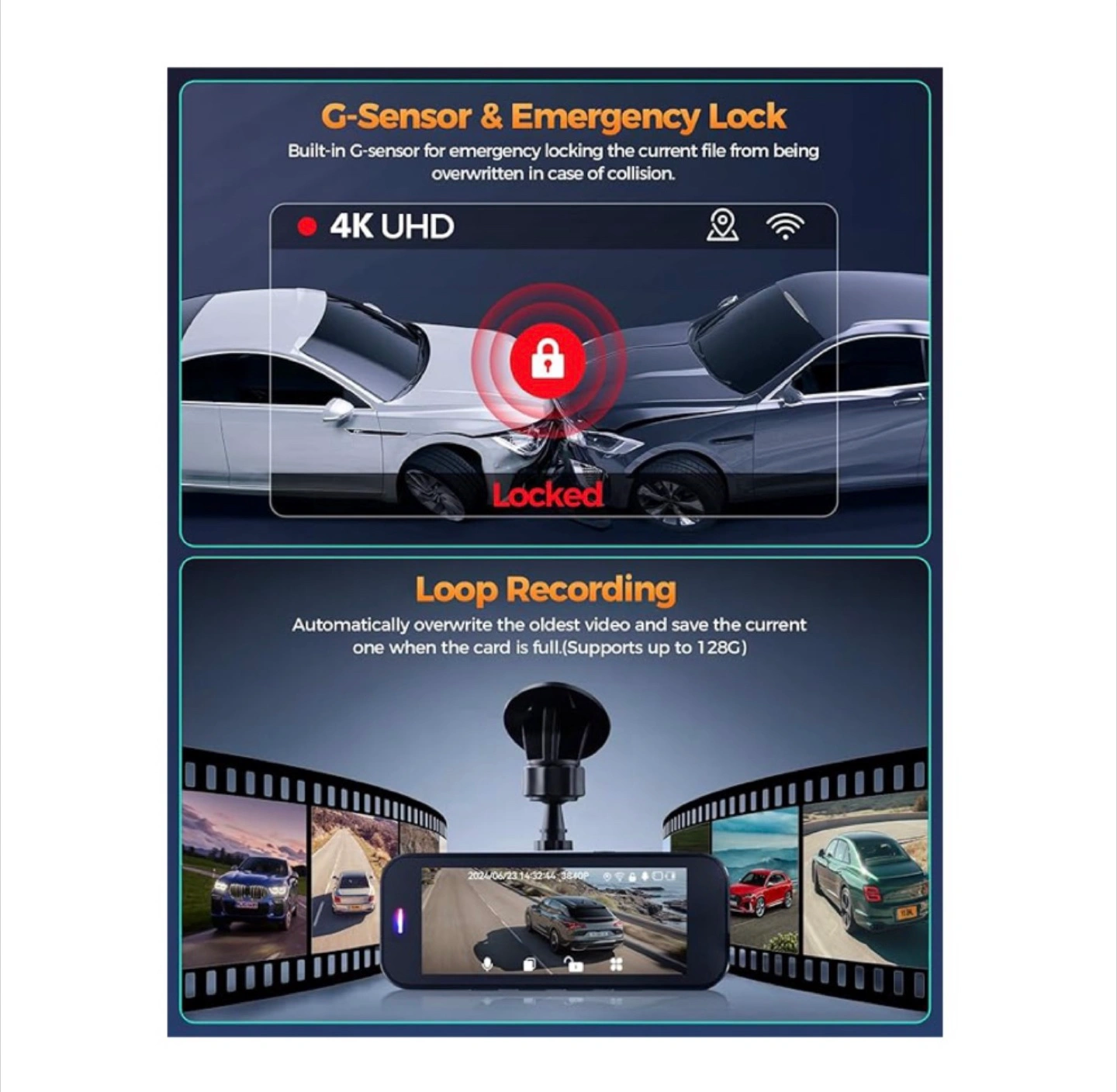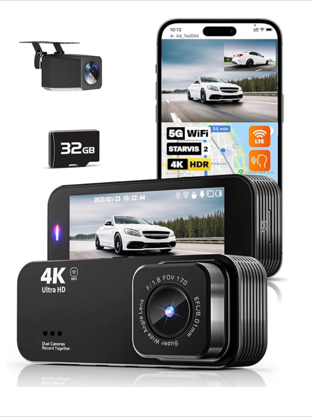 72Selling a dash camera for your car! This dash cam records in 4K+1080P, giving you a clear view of the road. It also has 5G WiFi, a built-in 32GB SD card, night vision, G-sensor, loop recording, and 24H parking mode. It also supports up to 128G.