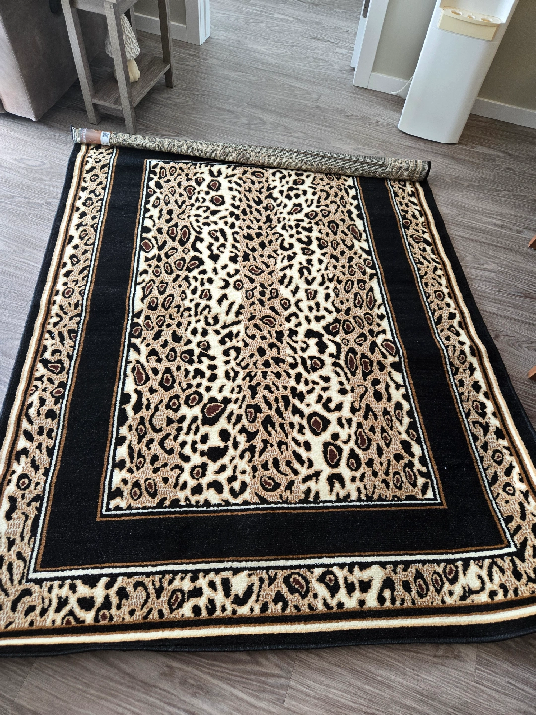 Selling a stylish area rug with a bold leopard print design. It's brand new. never been used. purchased but changed theme before using it. The rug features a black border and a unique pattern, perfect for adding some flair to your space