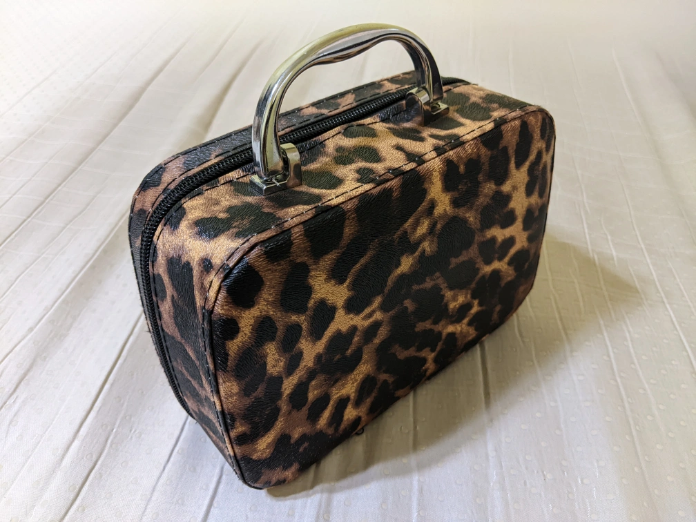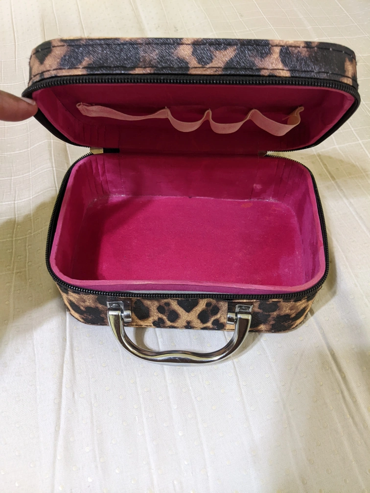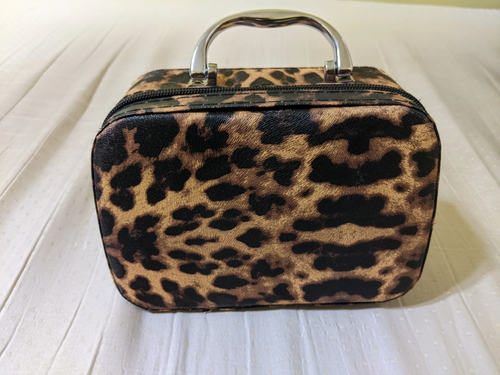Small zipped travel case. Features a leopard print design and a silver handle. Pink interior lining. Perfect for toiletries or jewellery.